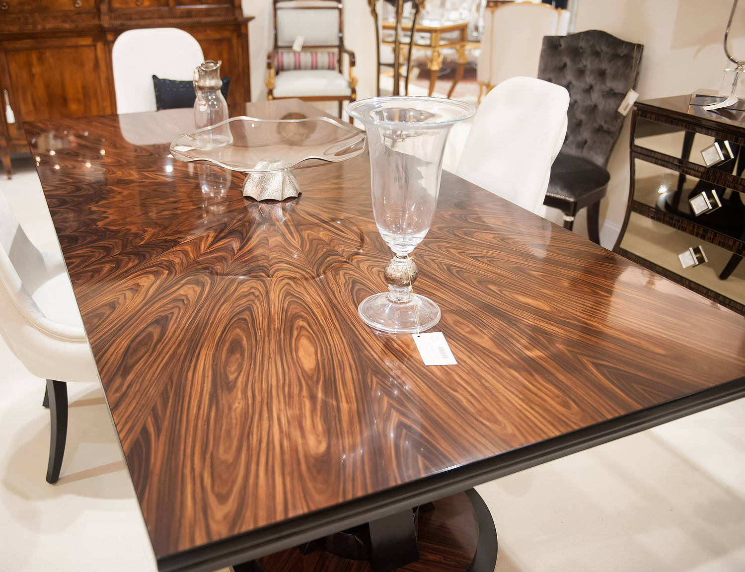 Absolutely stunning contemporary dining table featuring beautiful book matched walnut veneers and detailed with inlaid mother of pearl in center. Retractable butterfly extension leafs are built in on each end.