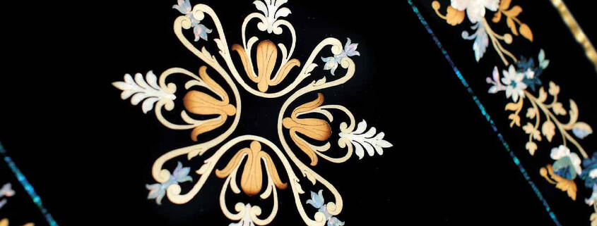 Veneers of natural woods and precious materials are hand-cut, shaded, and meticulously assembled—one fragment at a time—into floral garlands, medallions, and pictorial compositions. No two pieces are ever identical; each is a singular work reflective of the artisan’s hand and the expressive depth of the natural materials.