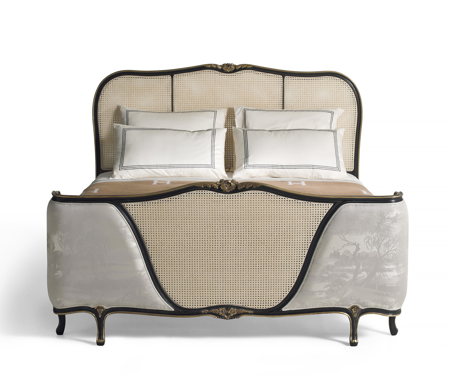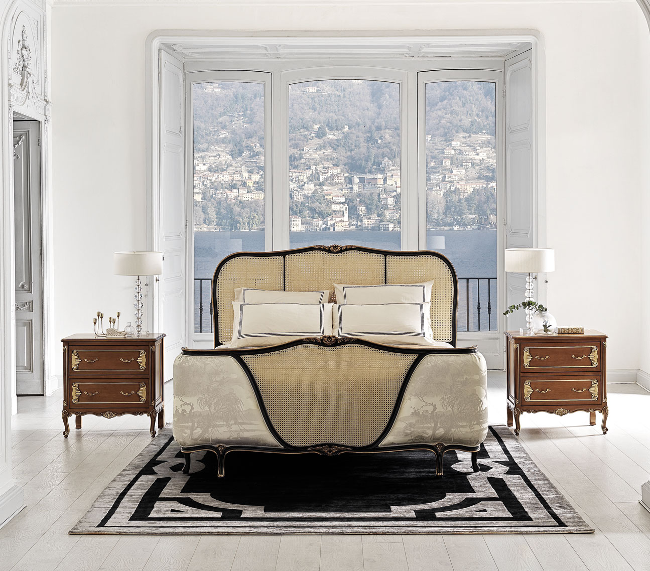 Gracefully merging Old World elegance with a fresh contemporary sensibility, this Louis XV- inspired bed is a refined showpiece for luxurious interiors. The flowing silhouette of the headboard and footboard is accentuated by hand-carved ornamentation and finished in a deep matte black lacquer with antiqued gold detailing, creating a striking contrast with the natural Vienna straw panels inset into each frame. The gently arched profiles, cabriole legs, and sculpted crown carvings echo the romantic curves of classic French design, while the addition of custom-patterned fabric panels on the footboard adds depth and texture. A masterful blend of craftsmanship and style, this piece reinterprets a best-selling classic for the modern era – ideal for interiors where tradition meets timeless sophistication. Handcrafted in Italy.