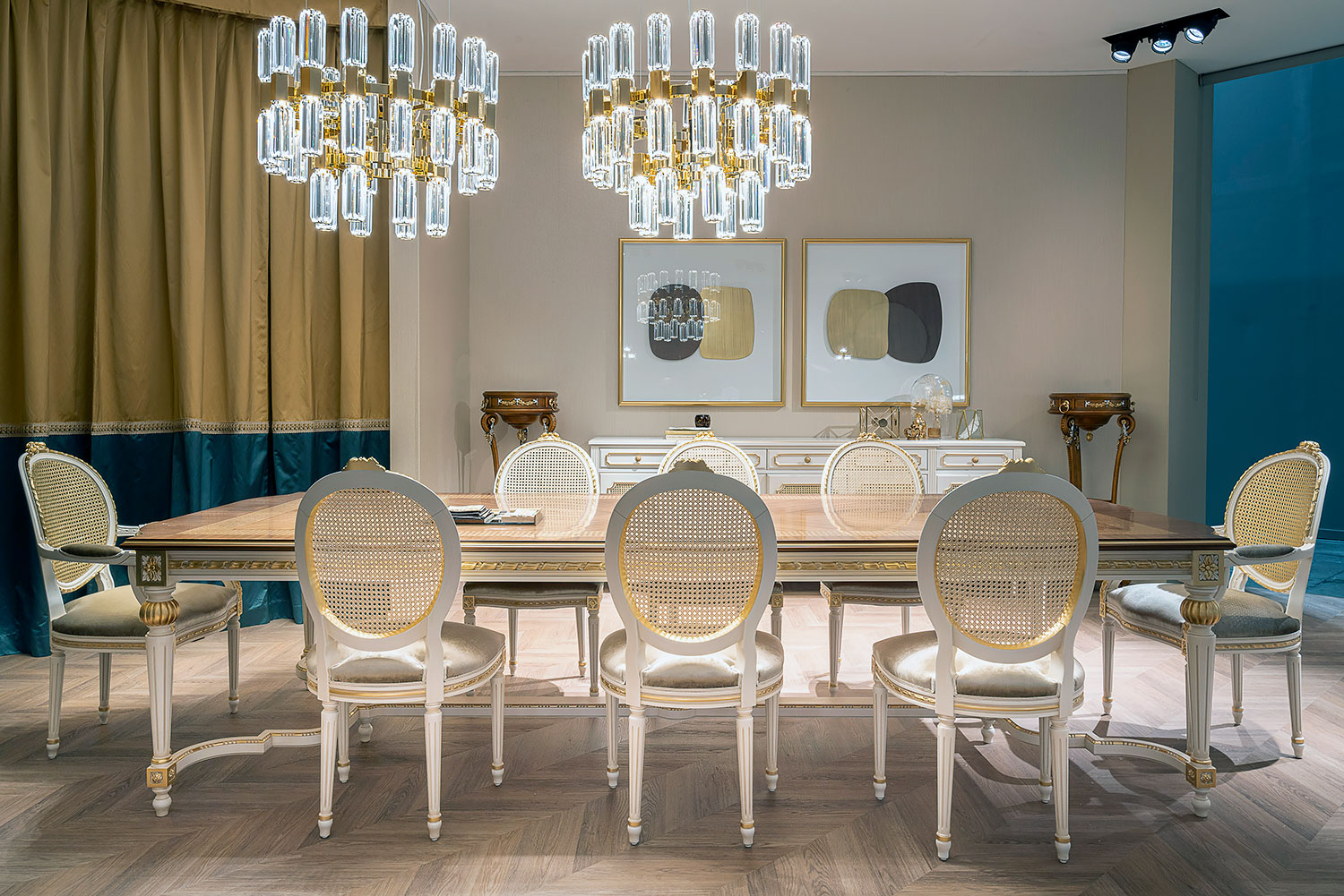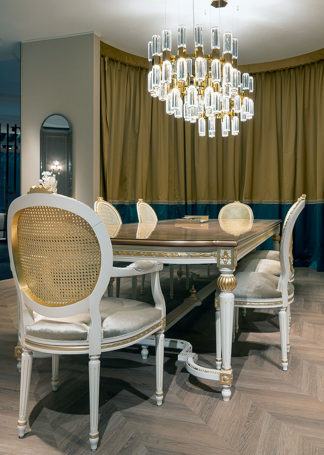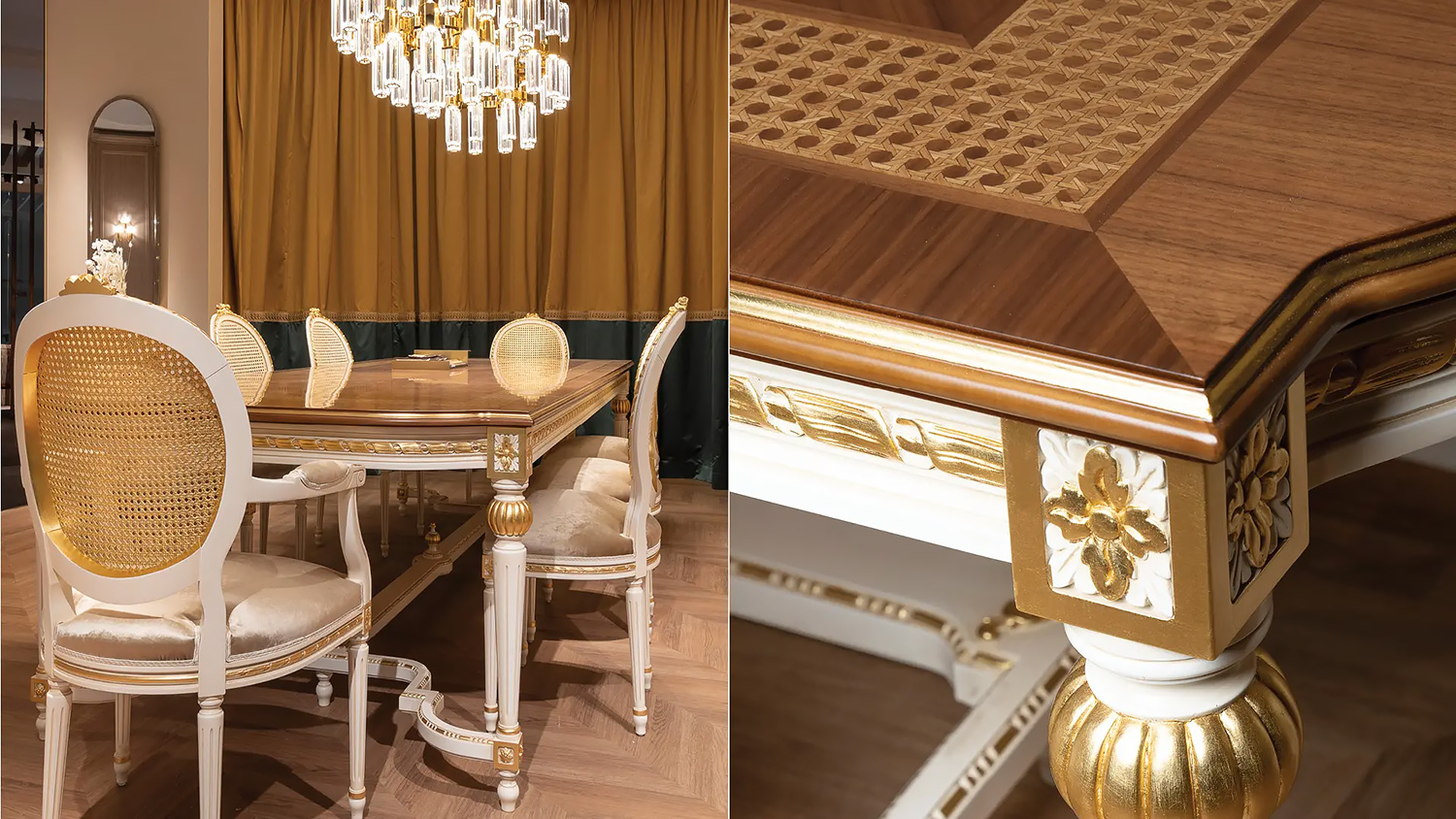 A masterwork of neoclassical elegance, the Louis XVI Cezanne dining table is defined by harmonious proportions and artistic precision. Its commanding top features an intricate inlaid border that evokes the classic Vienna straw weave – skillfully executed to enhance the natural beauty of the wood and add a refined element of visual texture. The solid frame rests on hand-turned and fluted legs, joined by a shaped stretcher with a decorative finial at center. Gold leaf detailing and delicately carved floral medallions accent the corners and baluster motifs, echoing the tradition of 18th-century craftsmanship. With its elegant silhouette and timeless materials, this table offers a sophisticated focal point for formal dining interiors. Handcrafted in Italy.