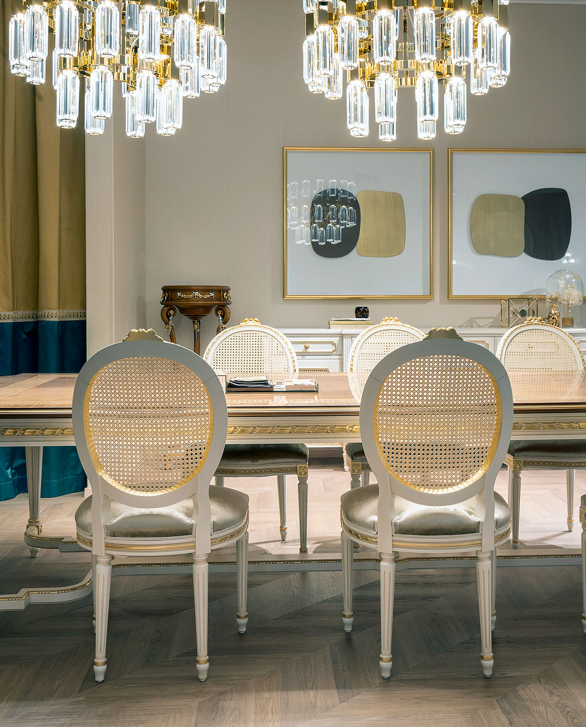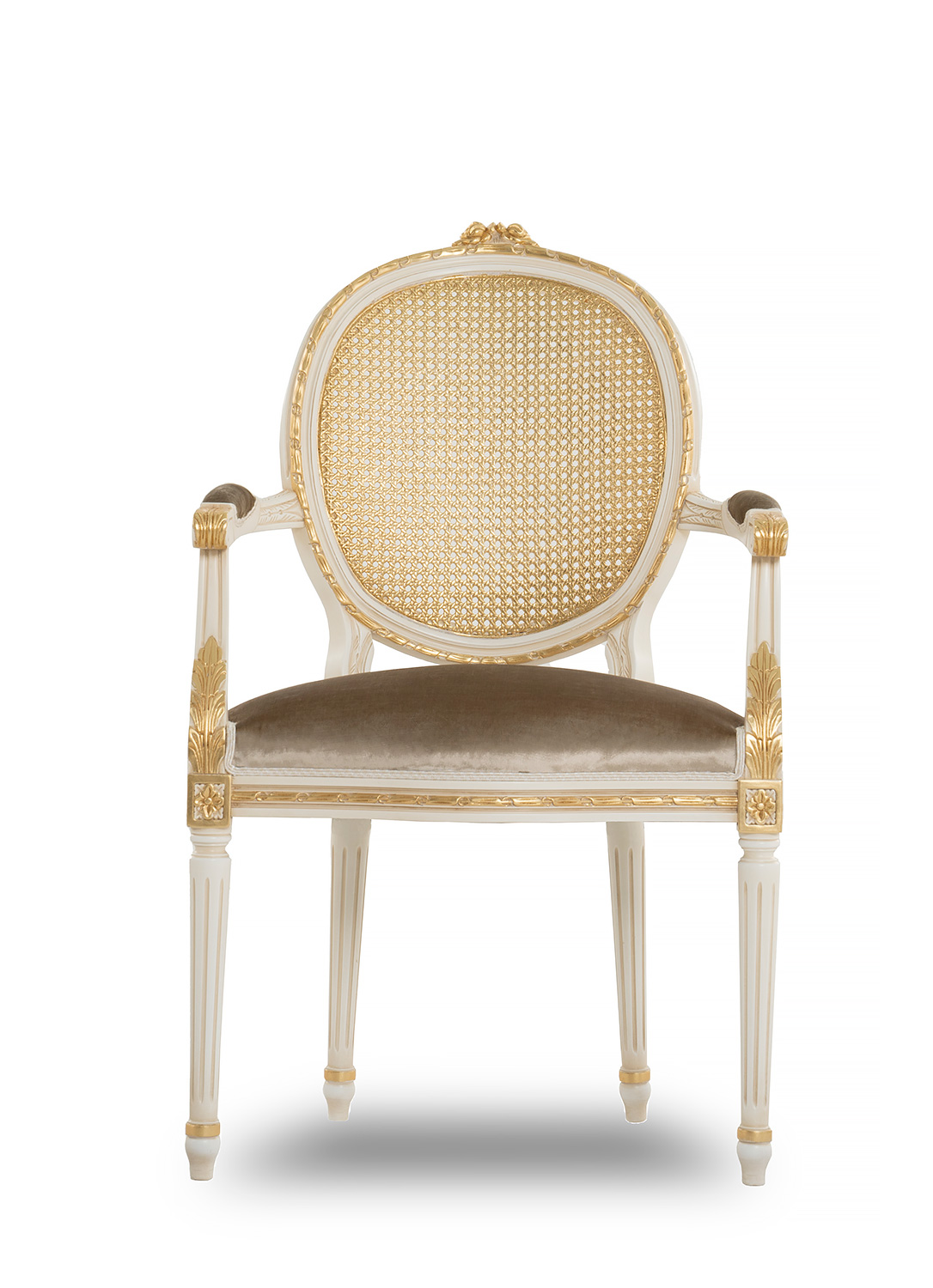 Graceful and timeless, this Louis XVI-style dining armchair is a testament to Italian artisanry and classical refinement. The open-back design features handwoven Vienna straw, delicately framed by a sculpted oval surround that allows natural light to pass through – offering a sense of lightness and airiness. The solid wood frame is adorned with meticulously hand-carved floral motifs and classical accents, finished in an ivory-toned lacquer with gold leaf embellishments. Fluted legs and padded armrests further enhance its regal profile, while the plush velvet seat provides luxurious comfort. An exquisite choice for formal dining settings or refined interior compositions. Handcrafted in Italy.
