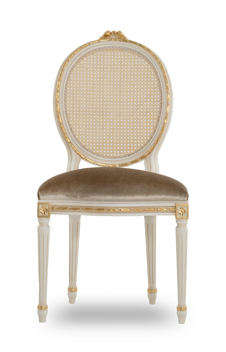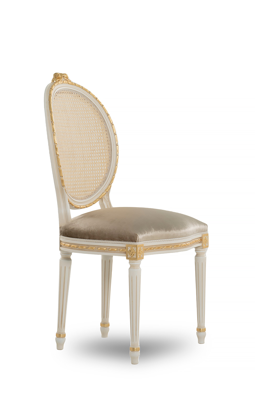 Graceful and timeless, this Louis XVI-style dining side chair is a testament to Italian artisanry and classical refinement. The open-back design features handwoven Vienna straw, delicately framed by a sculpted oval surround that allows natural light to pass through – offering a sense of lightness and airiness. The solid wood frame is adorned with meticulously hand-carved floral motifs and classical accents, finished in an ivory-toned lacquer with gold leaf embellishments. Fluted legs and padded armrests further enhance its regal profile, while the plush velvet seat provides luxurious comfort. An exquisite choice for formal dining settings or refined interior compositions. Handcrafted in Italy.