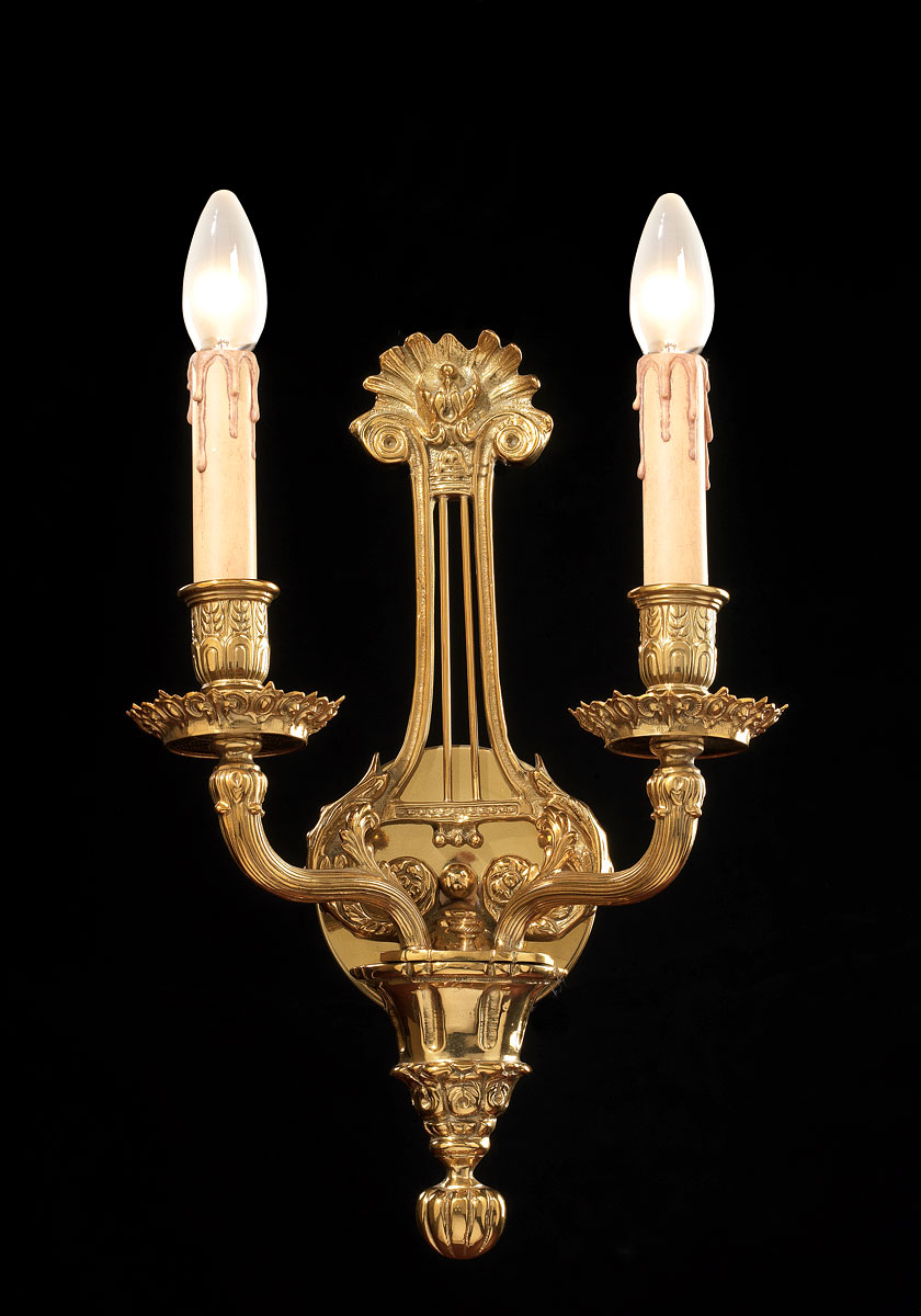 2 lights Sconce. Solid Brass with detailed floral scrolls. Shown in French Gold Plated finish. Takes 2 #E12 Candelabra style bulbs maximum 60 watts each. Made in Italy.