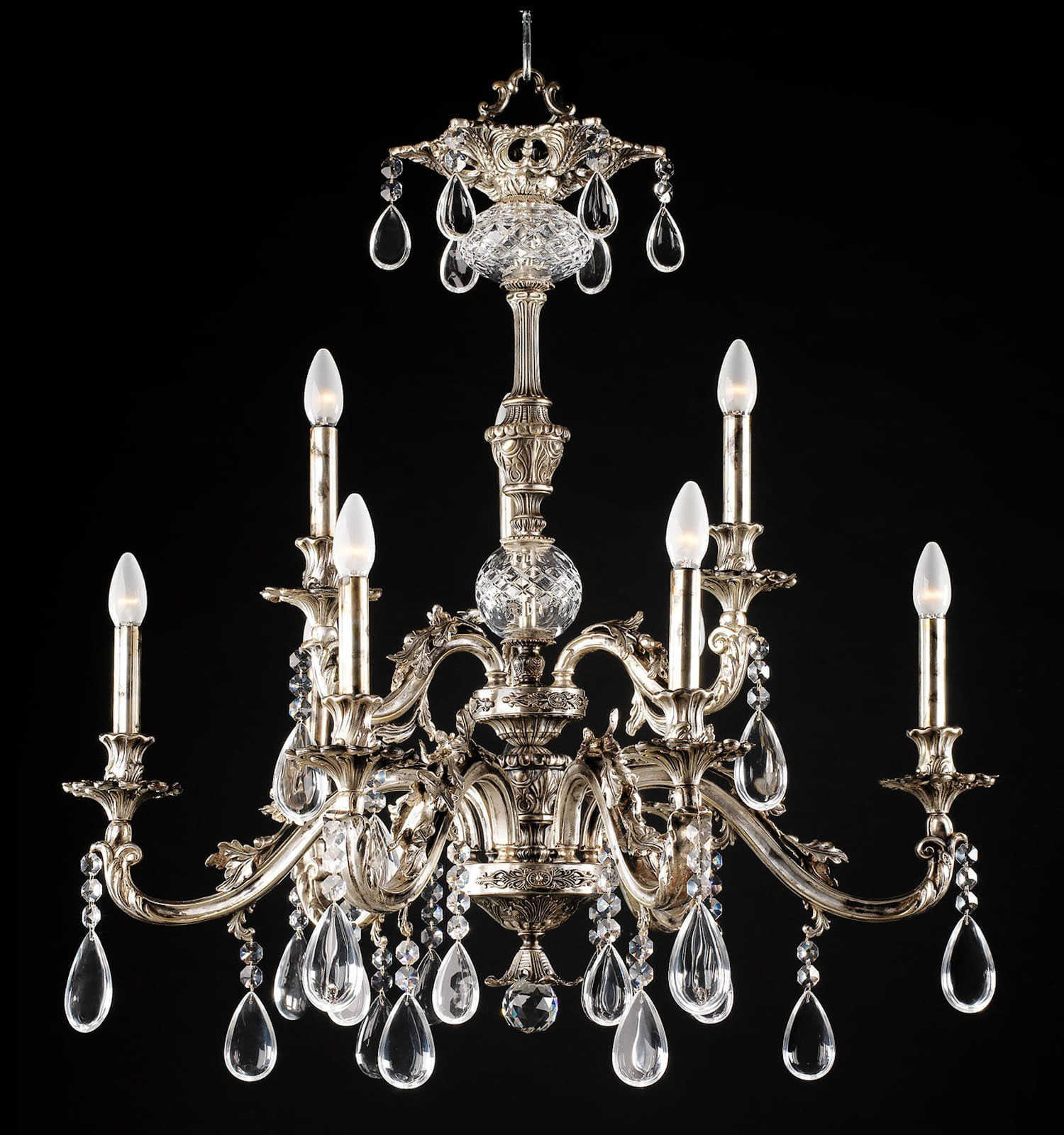 A breathtaking display of artistry and refinement, this handcrafted chandelier is cast in solid brass and finished in a luxurious antique nickel. The elegantly curved arms are adorned with hand-cut crystal drops, reflecting light with unparalleled brilliance. Ornate detailing, including intricately sculpted motifs and cut crystal spheres, enhances its regal charm. Designed for 9 E12 chandelier bulbs (max 60W each), this Italian-made masterpiece is available in many custom finishes, bringing timeless sophistication to any grand interior.