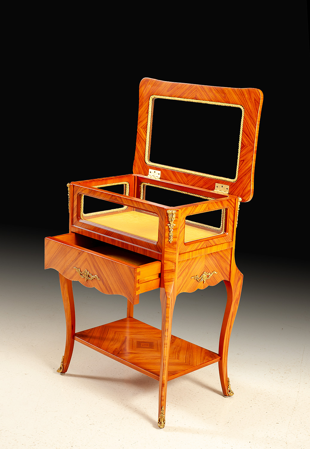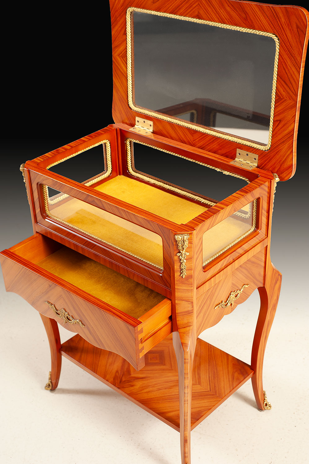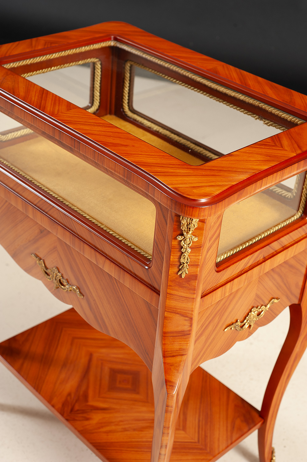 A refined showcase of Italian artisan mastery, this curio table blends meticulous marquetry, graceful architecture, and luxurious detailing. Handcrafted in Italy, the piece is clad in rich rosewood veneers arranged in beautifully matched patterns that highlight the natural movement of the grain. Every surface glows with warm depth and luster, honoring the traditional cabinetmaking techniques still practiced by Italian ateliers. The upper compartment features glass panels on all sides, bordered with intricate rope-pattern trim, allowing light to illuminate the interior from every angle. The lift-top lid opens to reveal a fabric-lined display chamber – perfect for showcasing fine collectibles, jewelry, or personal mementos with the elegance they deserve. Below, a full-width drawer with gently scalloped detailing provides hidden storage. The drawer front is adorned with solid brass ormolu handles, each cast and chased by hand with crisp scrollwork. Additional ormolu embellishments accent the corners, legs, and feet, adding gleaming highlights that elevate the tables refined silhouette. Elegant cabriole legs support the structure, gracefully tapering to brass-mounted feet. A lower veneered shelf, book-matched and framed with precision, provides both visual balance and functional display space. A piece that blends beauty, craftsmanship, and versatility, this Italian curio table brings a touch of timeless sophistication to any interior – perfect as a statement accent, display table, or luxurious bedside companion.