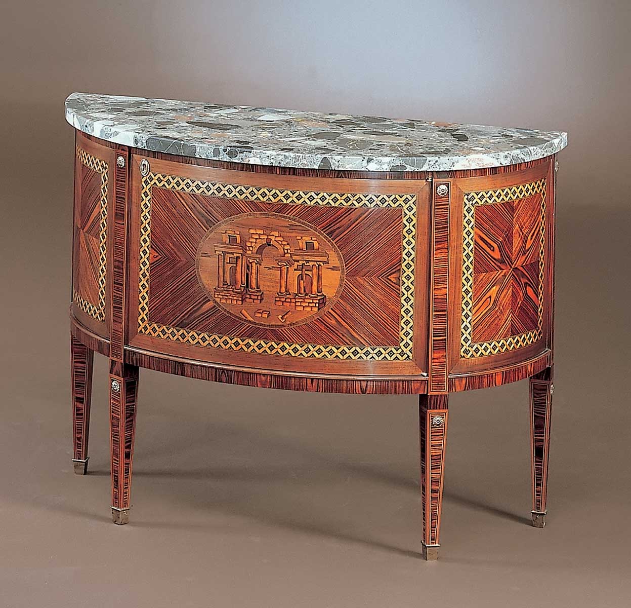 Small Demi Lune, hand-crafted in Italy, features rich rosewood adorned with architectural inlays in satinwood, elegantly framed by palisander borders. This refined piece includes a single door with a key lock for discreet storage and is photographed with a Verde Alpi marble top, blending timeless craftsmanship with sophisticated design.