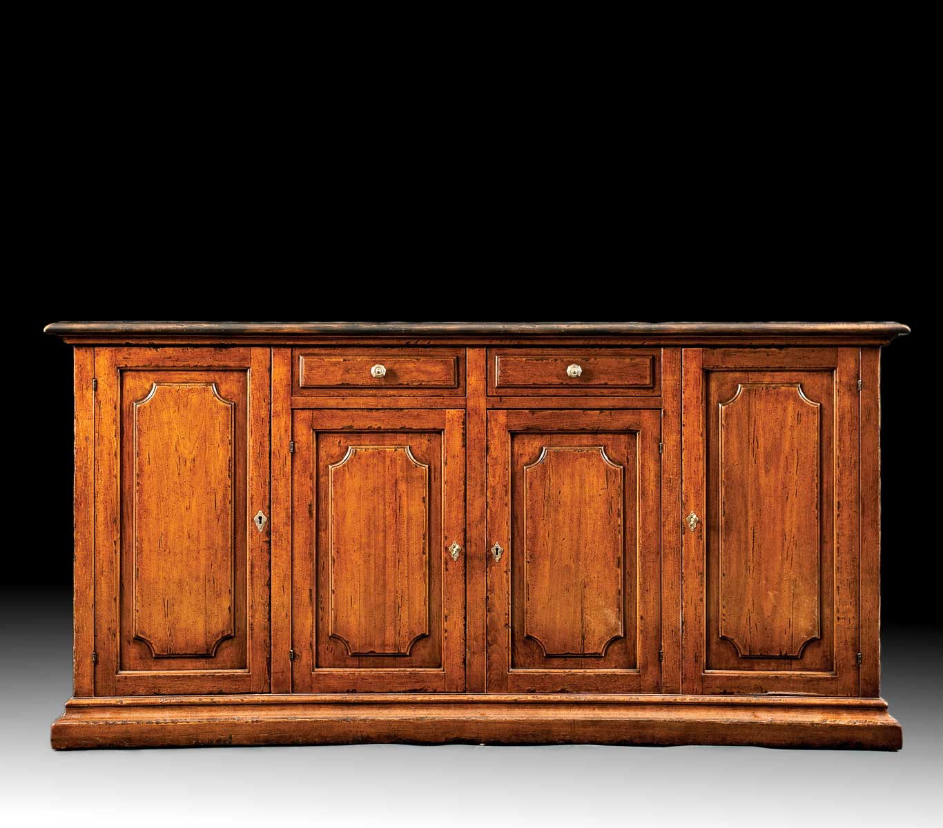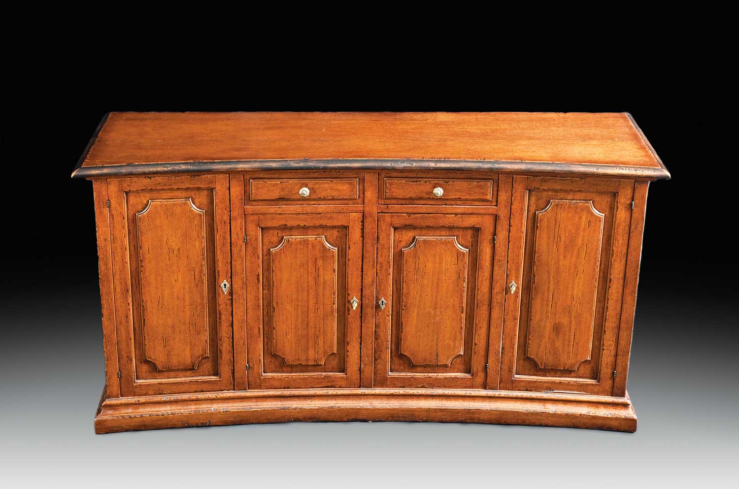 Meticulously handcrafted in Italy from solid walnut. This sideboard features a distinctive concave front that enhances its graceful profile, making it a standout piece in any room. The antique distressed finish, with a black rub-through accent on the top edge, provides a beautifully aged look that complements its classic design. Antique brass hardware adds a touch of sophistication and completes the timeless appeal. With two drawers and four raised panel doors, this sideboard offers ample storage space for your essentials. The key locking mechanism ensures security and peace of mind. Combining both form and function, this piece is perfect for adding both style and practicality to your living or dining area.