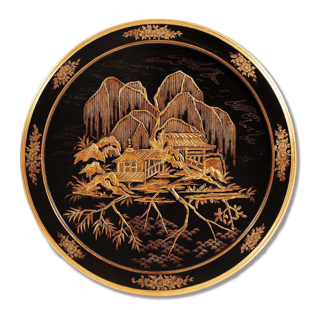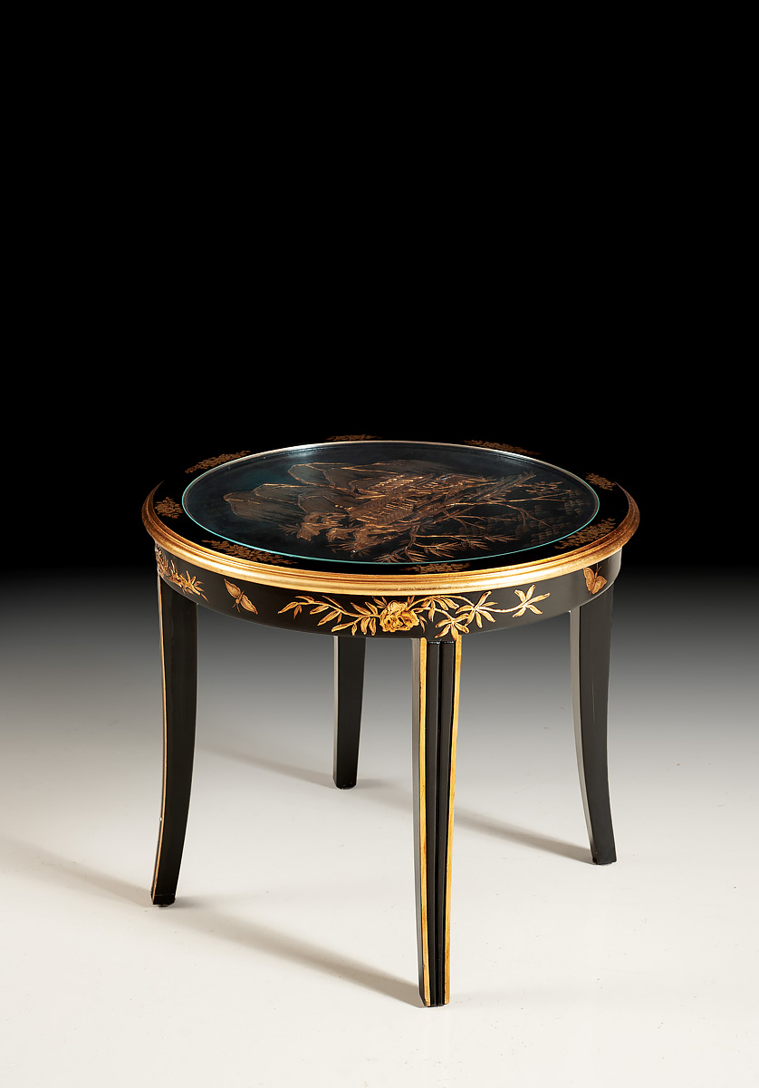 Three-Piece Set. Handcrafted in Italy, this set includes two chairs and a lamp table, all featuring a striking black lacquer finish adorned with intricate Chinoisery paintings. Upholstered in sumptuous silk velvet fabric for a touch of luxury.
