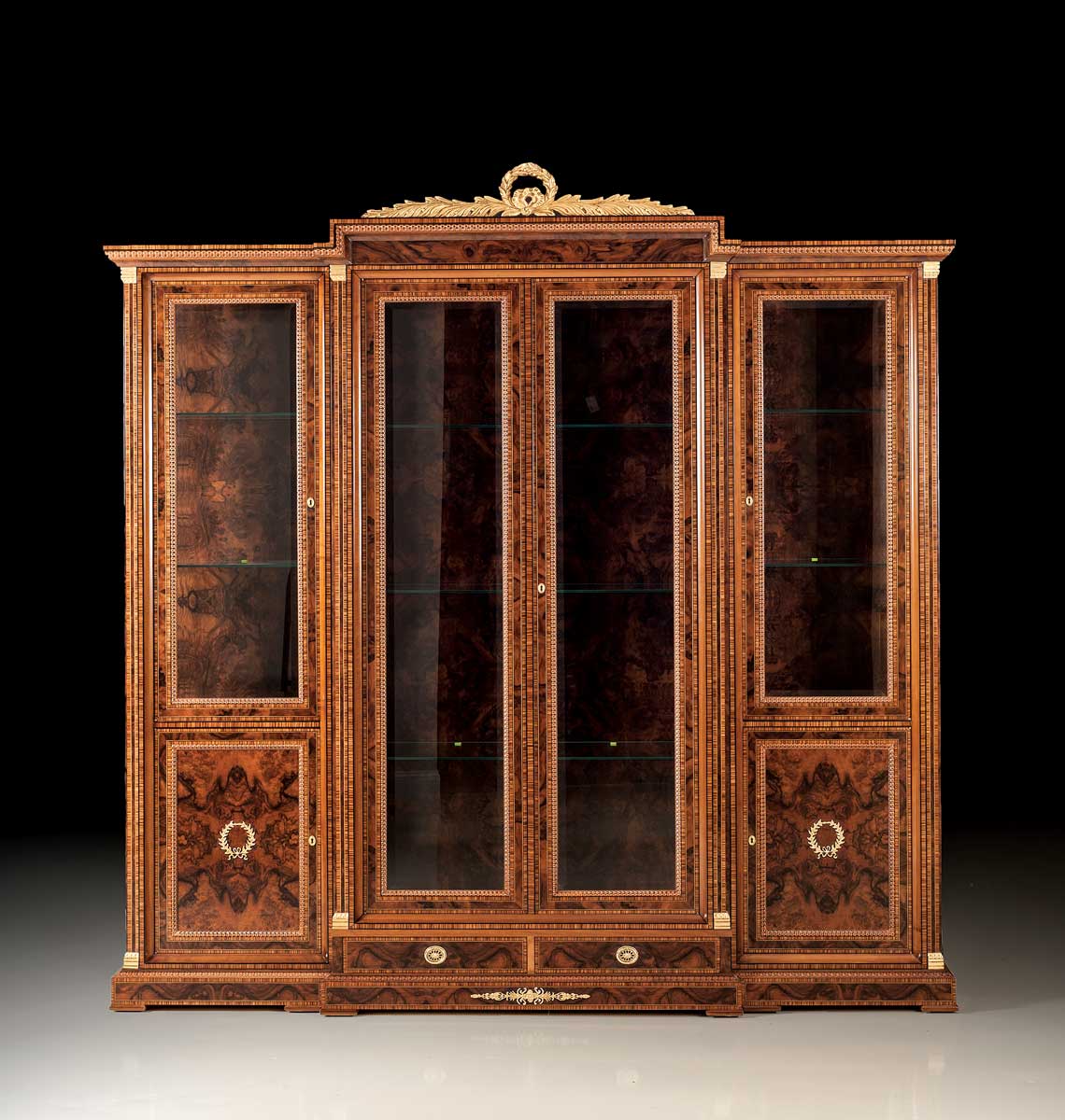 Empire style Breakfront. Hand crafted in Italy. Solid maple frame with walnut burl veneers and rosewood inlays. Carvings with 24 karat gold leaf. Two drawers. Two side doors with wood and beveled glass panels. Two glass shelves and one wood shelf in each side compartment. Two full length center doors with beveled glass. Three glass shelves in center compartment. Lighted interiors. Side panels with beveled glass. Solid brass ormolus and hardware. Classic medium sheen lacquer finish.