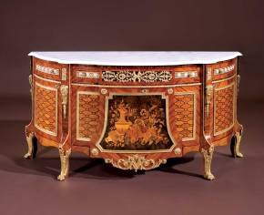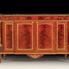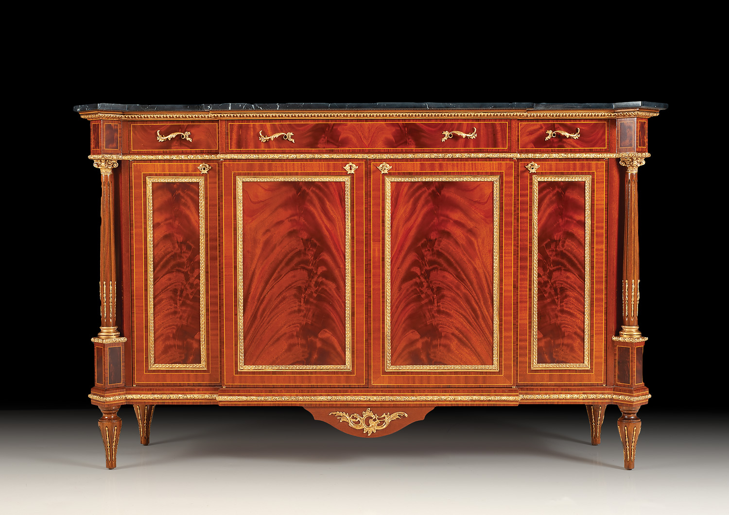 A magnificent display of classical refinement, this handcrafted English sideboard showcases sumptuous materials and exquisite detailing, making it a distinguished statement piece for elegant interiors. Crafted from solid mahogany and crotch mahogany veneers, the sideboard features a lustrous grain pattern enhanced by hand-applied inlays. The polished black marble top provides a striking contrast, offering both durability and sophistication. The facade is adorned with solid brass ormolus, framing the panels with intricate floral and acanthus motifs. Fluted corner columns with gilded capitals and ornate brass hardware further highlight the pieces Regency-inspired grandeur. Designed for both beauty and functionality, the sideboard features three drawers with gilded brass pulls and four doors with key locks, enclosing a spacious interior with a single shelf ideal for fine china or dining essentials. Resting on tapered, fluted legs with gilded accents, this stately sideboard is a masterpiece of European furniture-making, merging luxury and practicality in a timeless design.