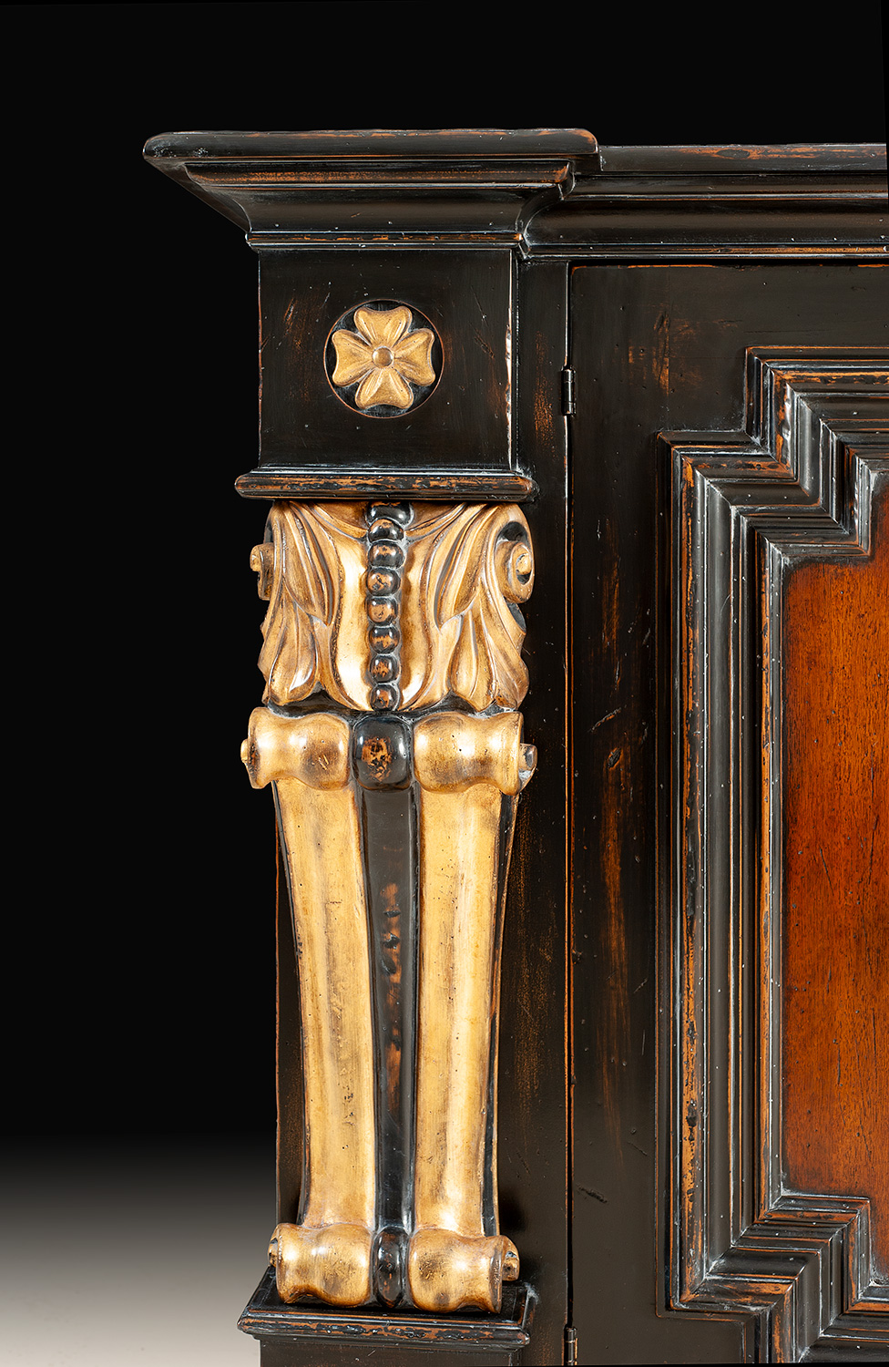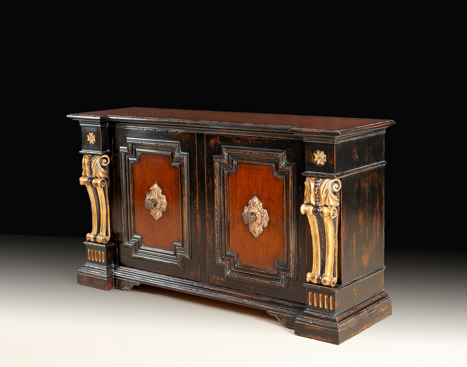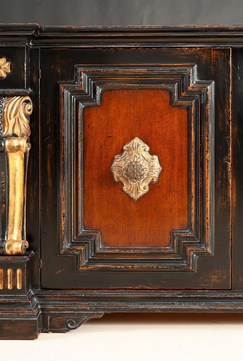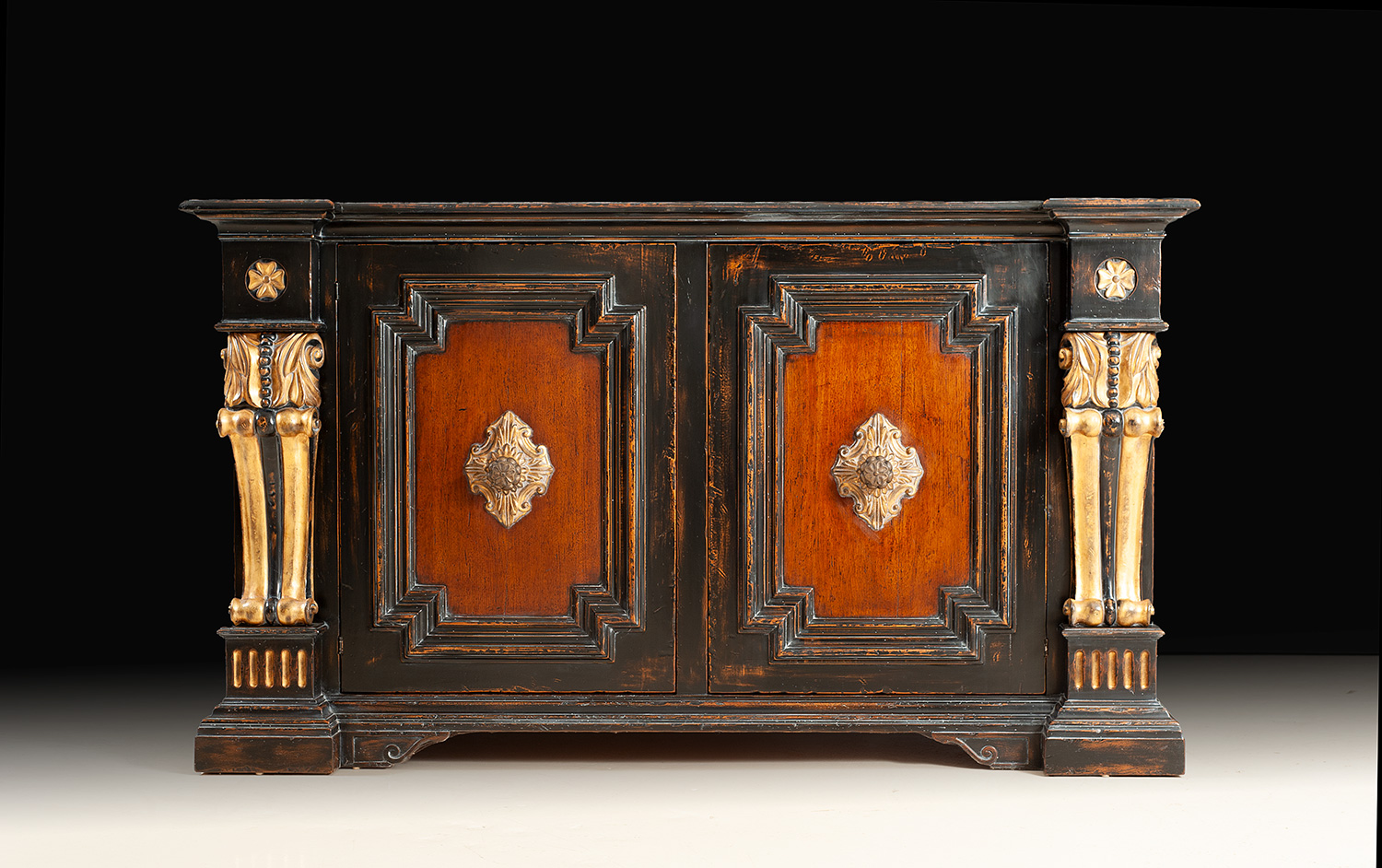 Handcrafted in Italy from solid walnut, this magnificent sideboard is a showcase of classical European craftsmanship and luxurious ornamentation. The rich walnut body is rendered in a warm, hand-polished finish that highlights the depth of the grain, while the architectural facade is framed with deeply molded panels and bold, sculptural detail. The standout feature is the pair of hand-carved pilasters, each meticulously shaped and adorned with genuine 14K gold leaf. These columnar forms, inspired by grand Italian palazzo architecture, create a dramatic vertical rhythm and lend regal presence to the piece. The inset door panels are bordered with wide molding and centered with hand-carved rosettes, also finished in 14K gold leaf for an added note of refinement. Both doors operate with solid brass knobs connected to a traditional key-lock mechanism. Inside, the left compartment is fitted with a silver drawer and one adjustable shelf, while the right side offers two full-width shelves, providing versatile storage for dining service, barware, or collectibles. An heirloom-quality furnishing of exceptional artistry, this sideboard blends Italian heritage with luxurious hand-finishing, perfect for formal dining rooms, grand living spaces, or richly appointed entry halls.