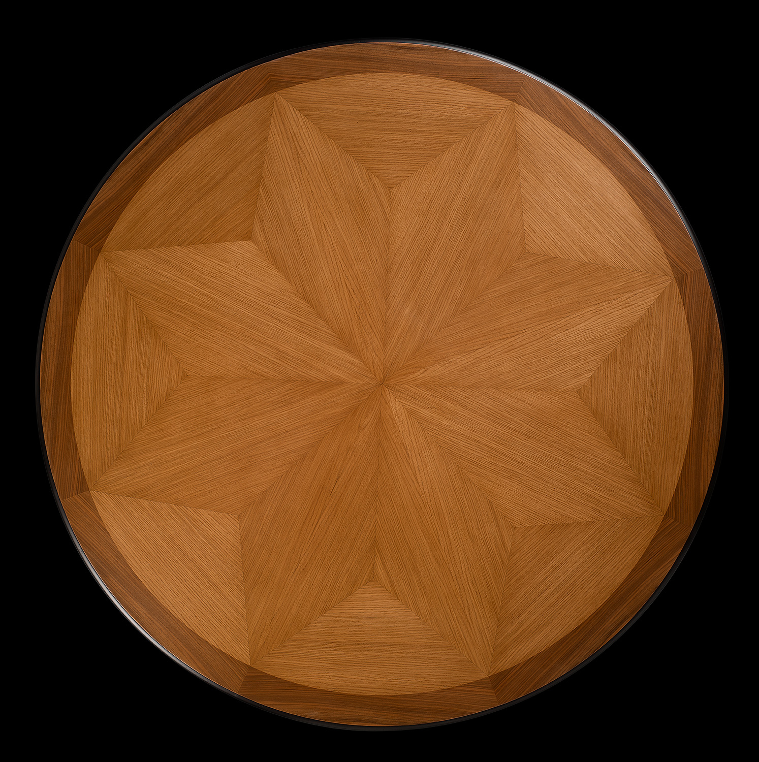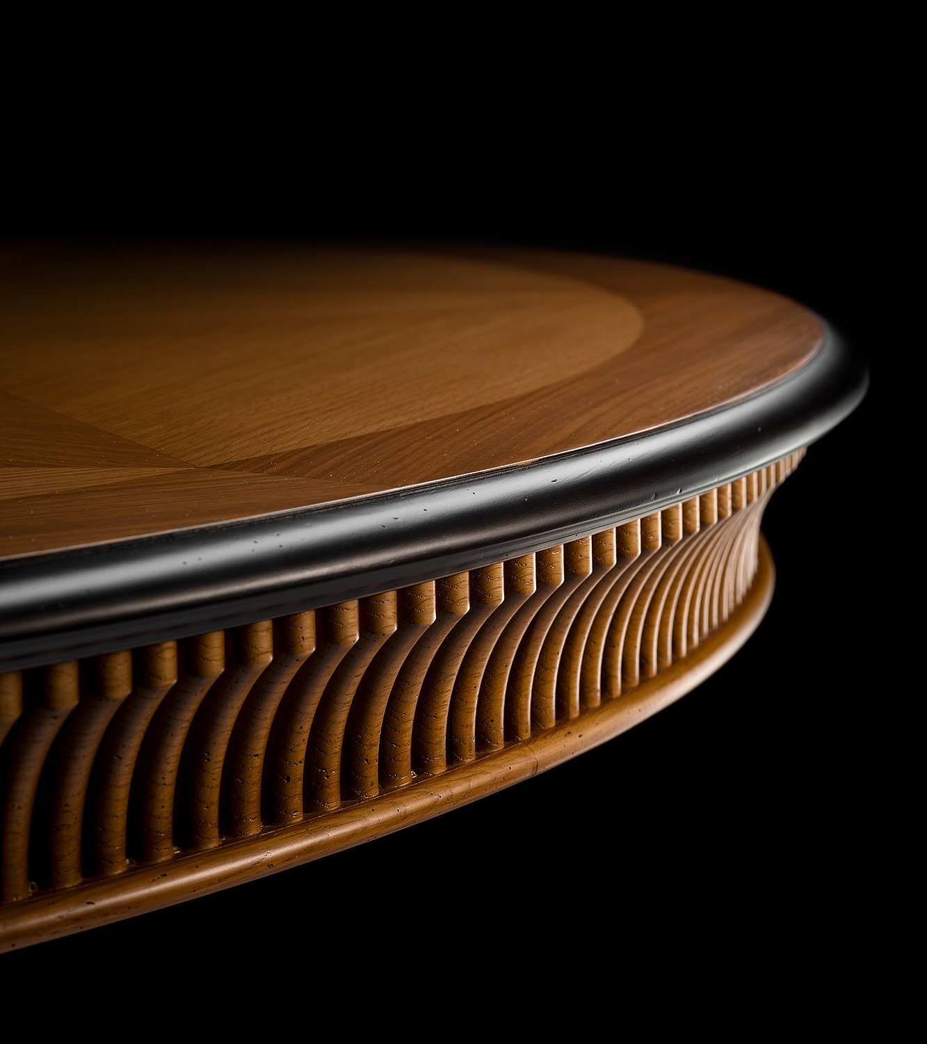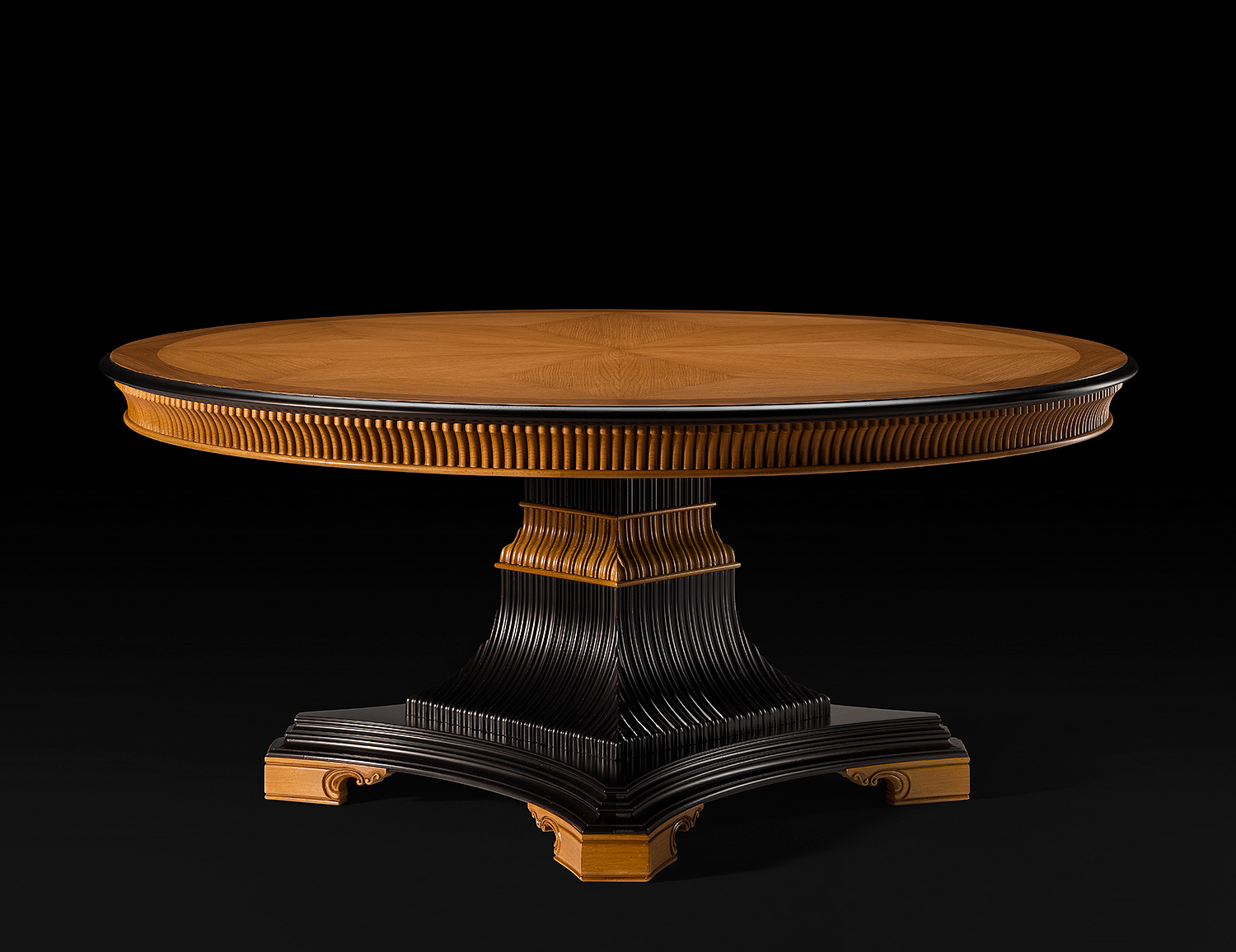 This commanding 72-inch round dining table is a masterpiece of Italian craftsmanship, offering both architectural strength and ornamental grace. The starburst inlay on the tabletop radiates outward in a precisely matched veneer pattern, highlighting the natural beauty and geometry of the wood. The fluted apron and tiered pedestal base are richly finished in a dramatic two-tone palette of warm honey and deep espresso, with sweeping scroll feet and elegant carvings that underscore its sculptural presence. A bold centerpiece for refined dining interiors, this table seamlessly bridges neoclassical inspiration with modern Italian elegance. Handcrafted in Italy.