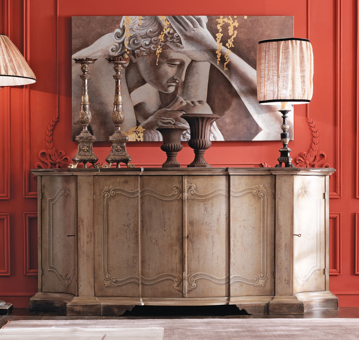 This elegant credenza features a gently curved silhouette with two concave side doors and two central overlaid doors. The hand-applied beige linen finish is softly distressed, enriched by subtle dark grey highlights and antique white painted scrollwork. Each compartment includes a single shelf, offering refined storage behind its sculptural facade. A timeless piece for traditional or transitional interiors. Handcrafted in Italy.