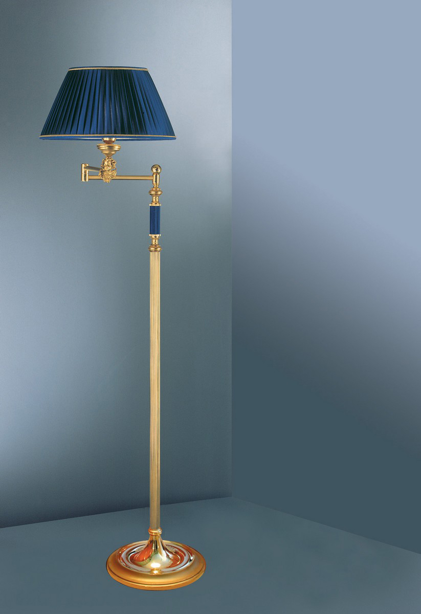 Floor Lamp. 24K Gold plating over Bronze Castings with enameled insert. Adjustable swing arm. Silk Pleated Shade. Hand made in Italy. Takes 1 x 60W E26 base bulb.