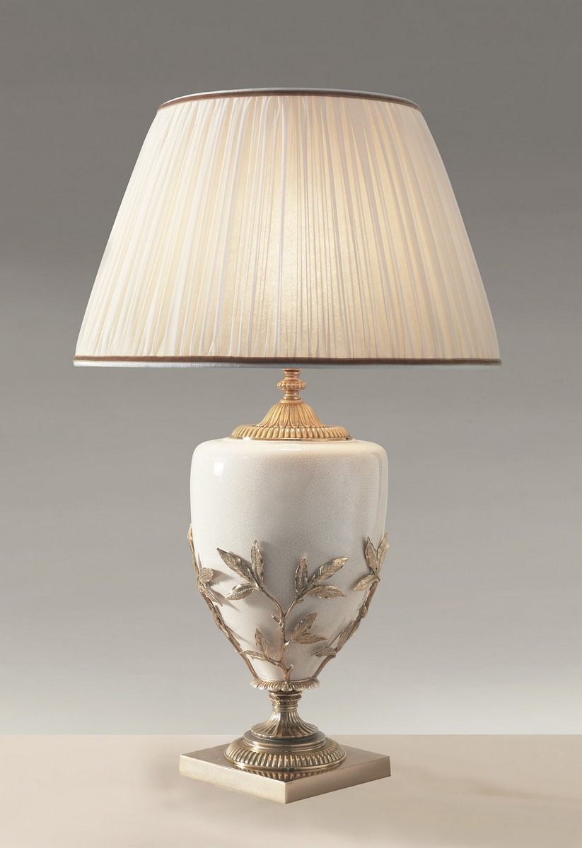 This elegant table lamp features a finely sculpted porcelain body in a warm ivory glaze, wrapped with intricate olive branch detailing in 24-karat gold-plated bronze. Resting on a square marble base and topped with a classic pleated silk shade, it offers a timeless blend of natural inspiration and refined luxury. Handcrafted in Italy by master artisans using traditional old-world techniques. This piece is fully customizable and available in a variety of finishes and design configurations. Requires 1 E27 base bulb, max. 100W.