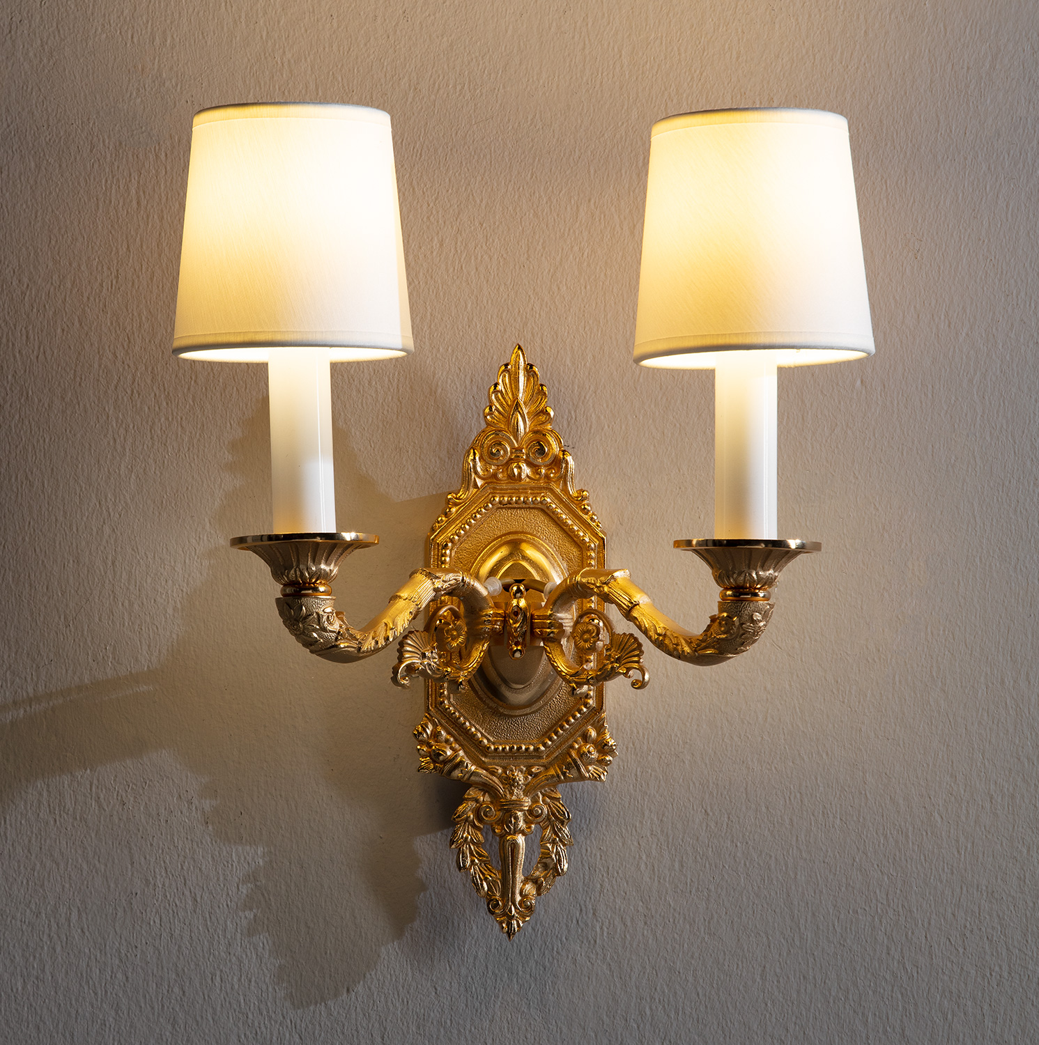 A stunning example of classical European craftsmanship, this wall sconce is cast in solid bronze and adorned with finely sculpted acanthus motifs, rosettes, and beaded trim. The double-arm design extends from an elaborately shaped backplate, finished in a warm, lustrous gold tone. Topped with tapered fabric shades for a soft, elegant glow. Requires two E12 bulbs. Handcrafted in Europe using time-honored techniques.