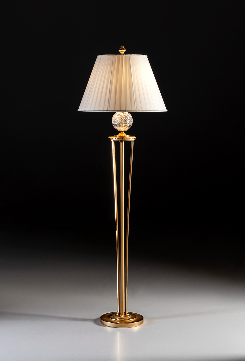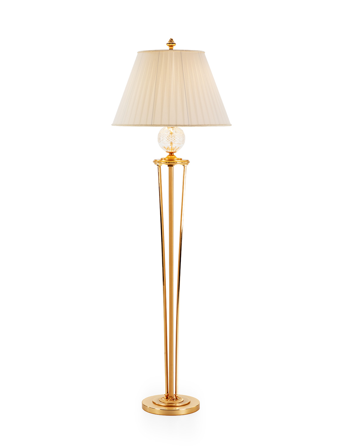 A sophisticated blend of classical elegance and modern form, this floor lamp features a slender bronze-cast frame finished in a warm gold tone. The centerpiece is a hand-cut Italian crystal globe that captures and reflects the light with timeless brilliance. A pleated fabric shade and ornate finial complete the design, offering ambient illumination ideal for refined living spaces. Requires two E26 bulbs. Handcrafted in Europe with exquisite attention to detail.
