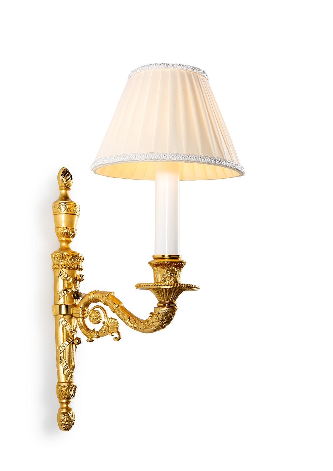 A masterwork of classical ornamentation, this wall sconce is meticulously cast in solid bronze and finished in rich gold. Its sculpted arm features intricate detailing inspired by neoclassical motifs, extending from a torch-form backplate adorned with ribbon and garland elements. Topped with a pleated silk shade, it delivers timeless charm and soft ambient light. Requires one E12 bulb. Handcrafted in Europe using traditional artisan techniques.