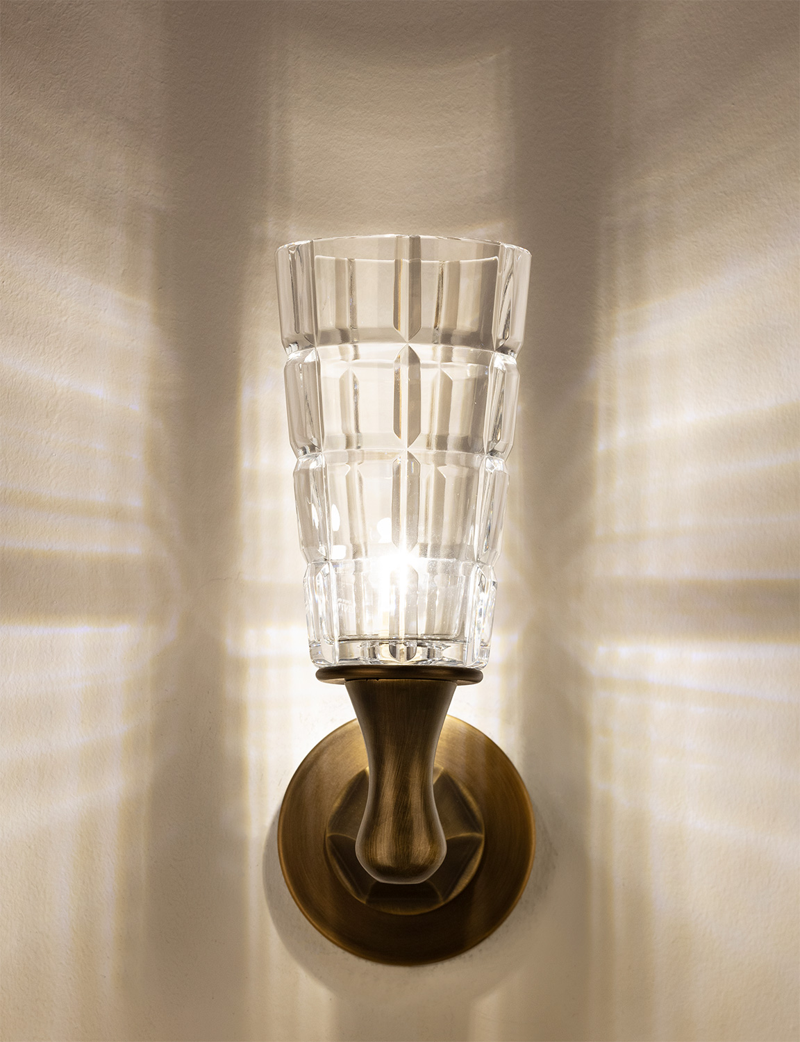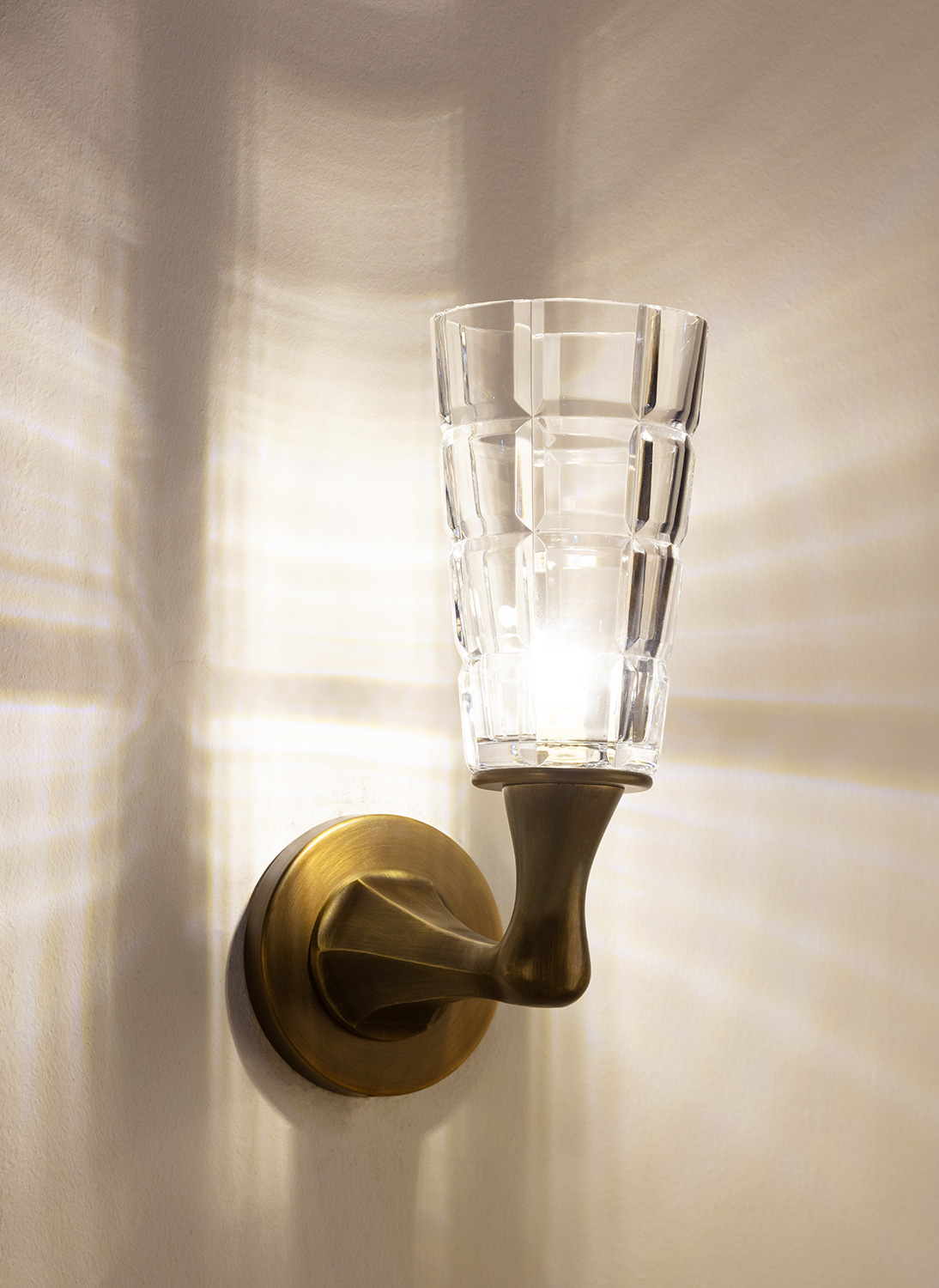 Wall sconce in cast bronze with a brushed finish, featuring a sculptural arm and faceted Italian crystal globe. The elegant geometric shade casts intricate light patterns, blending contemporary form with artisanal craftsmanship. Requires 1 G9 bulb.