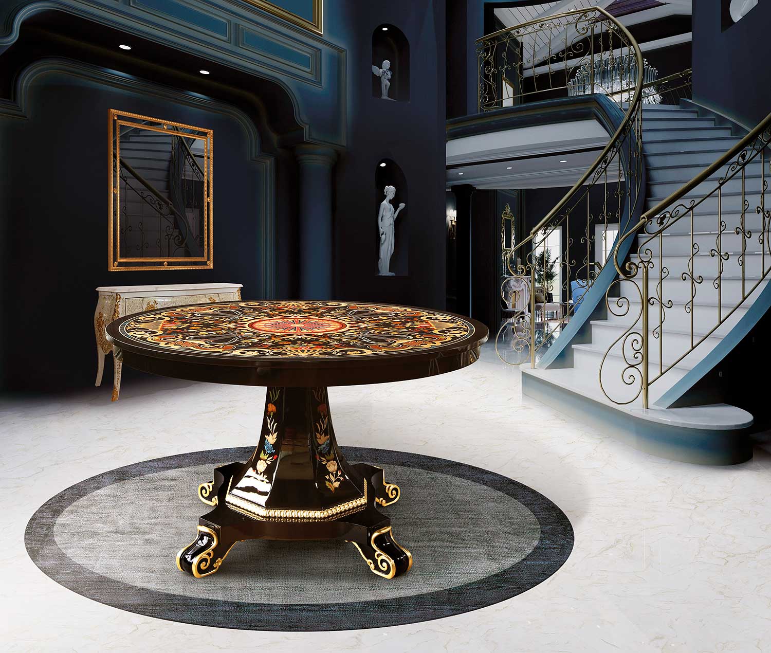 A work of extraordinary opulence and artistic mastery, this round dining table stands as one of the most elaborate expressions of Italian Intarsia craftsmanship. The tabletop is a breathtaking composition executed in Erable Nero – a rare, jet-black figured maple that forms the perfect dramatic backdrop for the explosion of color and detail achieved through natural wood inlays. At the center, a radiant medallion unfolds like an imperial sunburst, meticulously assembled from dozens of hand-cut elements in warm reds, golds, ivories, and cobalt tones. Encircling this focal point is a lavish tapestry of scrolling acanthus, stylized lyres, neoclassical urns, and vibrant floral bouquets, each shaped from precious veneers and arranged with painterly precision. The contrast of vivid natural woods against the deep black Erable Nero creates a visual depth that rivals lacquered objets d-art from royal collections. The sculpted pedestal base continues the narrative of extravagance. Entirely hand-decorated with matching Intarsia motifs, the base is further enriched with delicate carvings and architectural embellishments. Every curve, scroll, and floral relief is highlighted with a brilliant gold finish, catching the light with regal luminosity and echoing European palace traditions of the 18th and 19th centuries. Commanding yet exquisitely refined, this table is perfectly suited for grand foyers, palatial dining rooms, or elite collector interiors where artistry is central to the space. It is not merely a piece of furniture – this is a museum-caliber masterpiece, created by Italian artisans whose skill stands among the finest in Europe today.