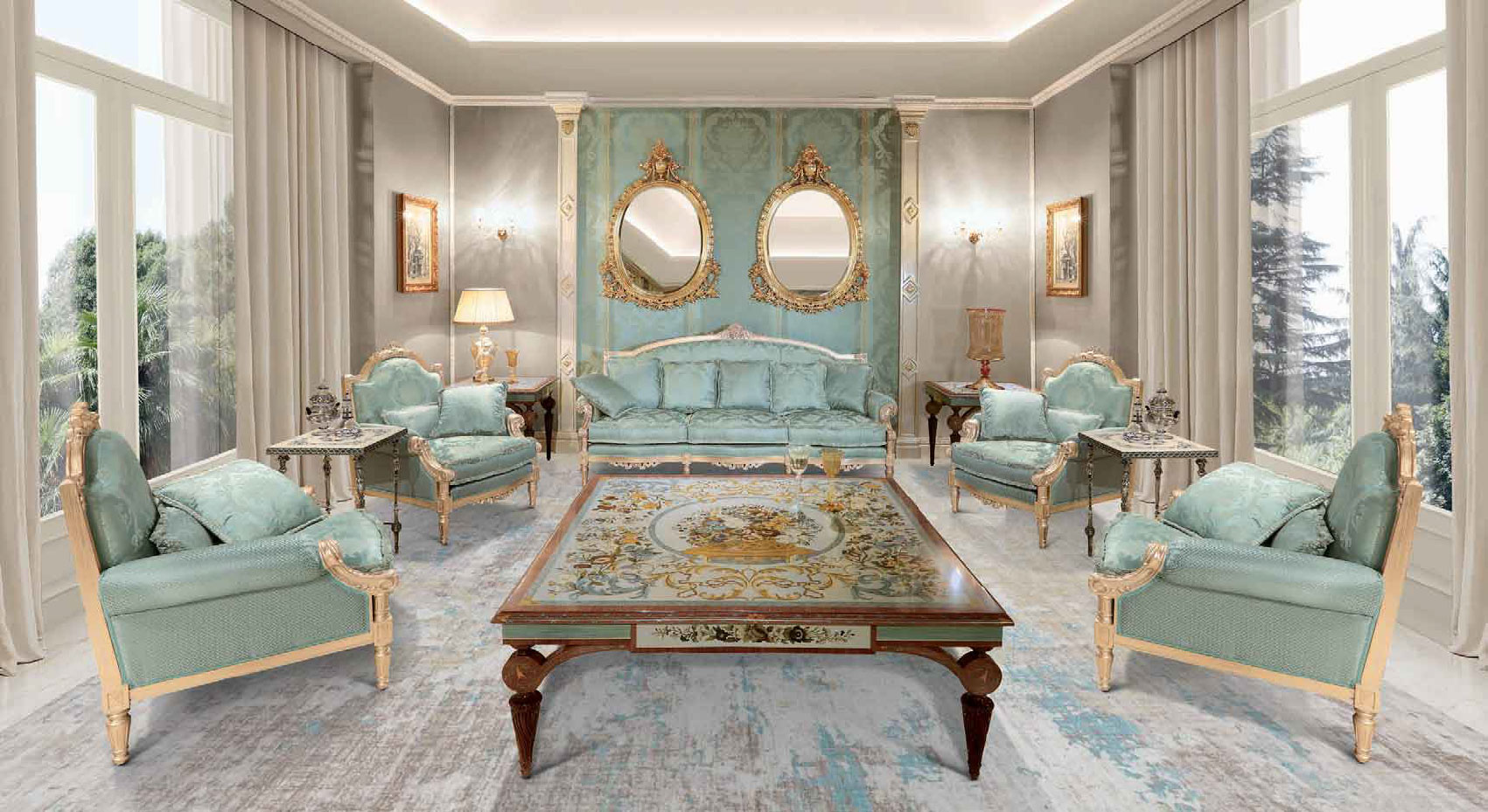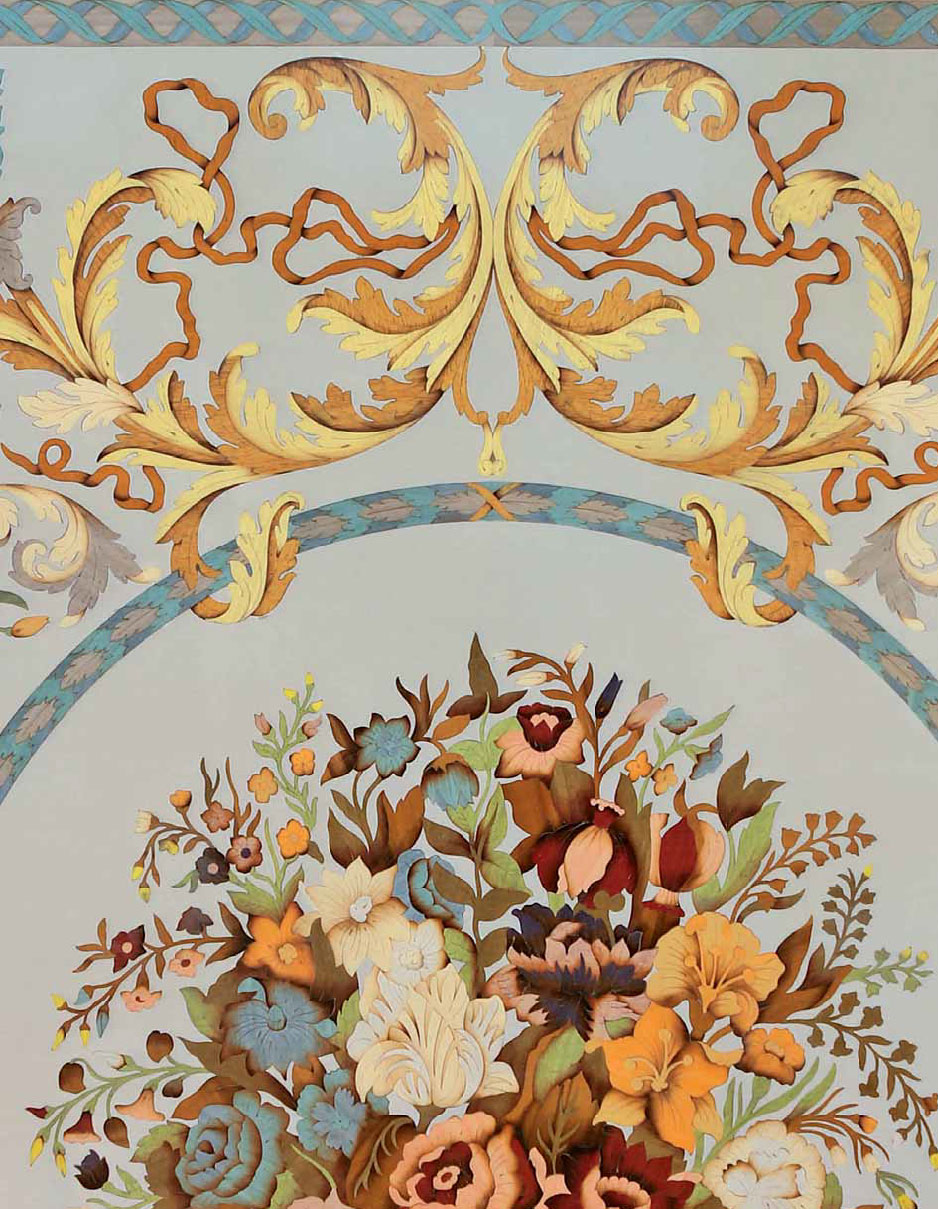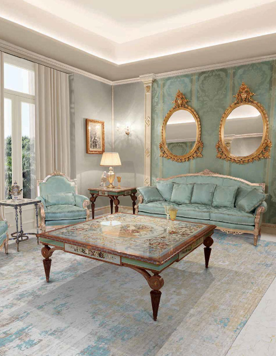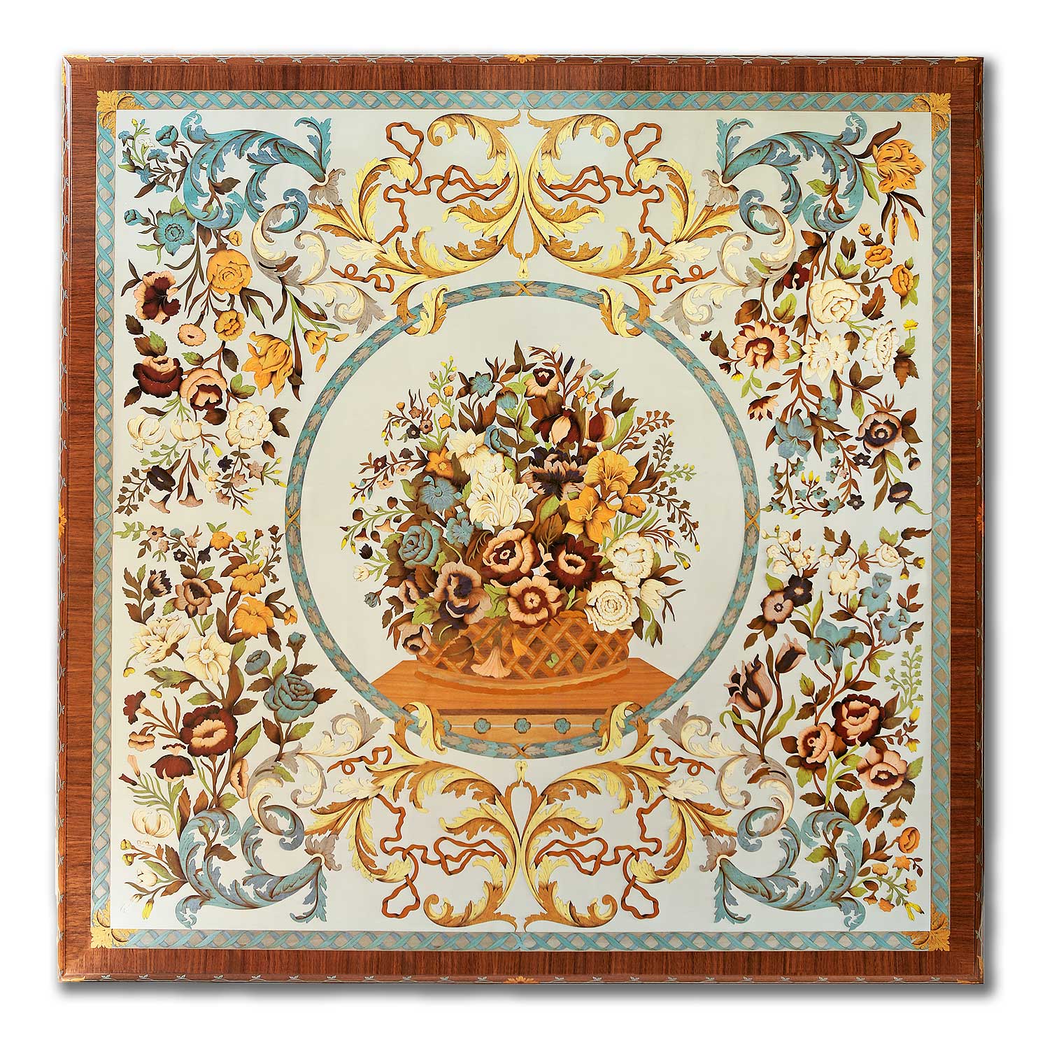 A statement of extraordinary elegance and artisanal mastery, this grand square coffee table showcases one of the most elaborate Intarsia compositions produced by Italys finest ebanisti. The tabletop features an exquisite still-life arrangement of flowers gathered in a classical woven basket – an artistic centerpiece meticulously formed from naturally colored wood veneers and enriched with the subtle luminosity of mother-of-pearl details. Set upon a refined aluminum ground, the marquetry achieves an almost painterly depth, with each petal, leaf, and flourish capturing the richness of traditional Italian inlay artistry. Surrounding the central motif is a breathtaking symphony of scrollwork, botanical garlands, and ornamental borders in cool blues, warm golds, and soft neutrals – an intricate framing that transforms the entire top into a decorative tableau of museum caliber. A sculpted Canaletto walnut border adds warmth and architectural definition, completing the harmonious interplay between natural wood and luminous inlay. The generously scaled top is supported by a hand-carved Canaletto walnut base, whose tapered fluted legs and sculptural corner brackets reflect classical influences and refined craftsmanship. The natural finish reveals the depth and character of the wood grain, complementing the artistry above without distraction. Commanding yet graceful, this coffee table serves as the visual anchor of a sophisticated salon or formal living room. Its impressive size allows the full narrative of the Intarsia to unfold and be admired from every angle, making it not merely a functional furnishing but a centerpiece of Italian decorative art.