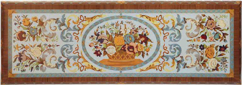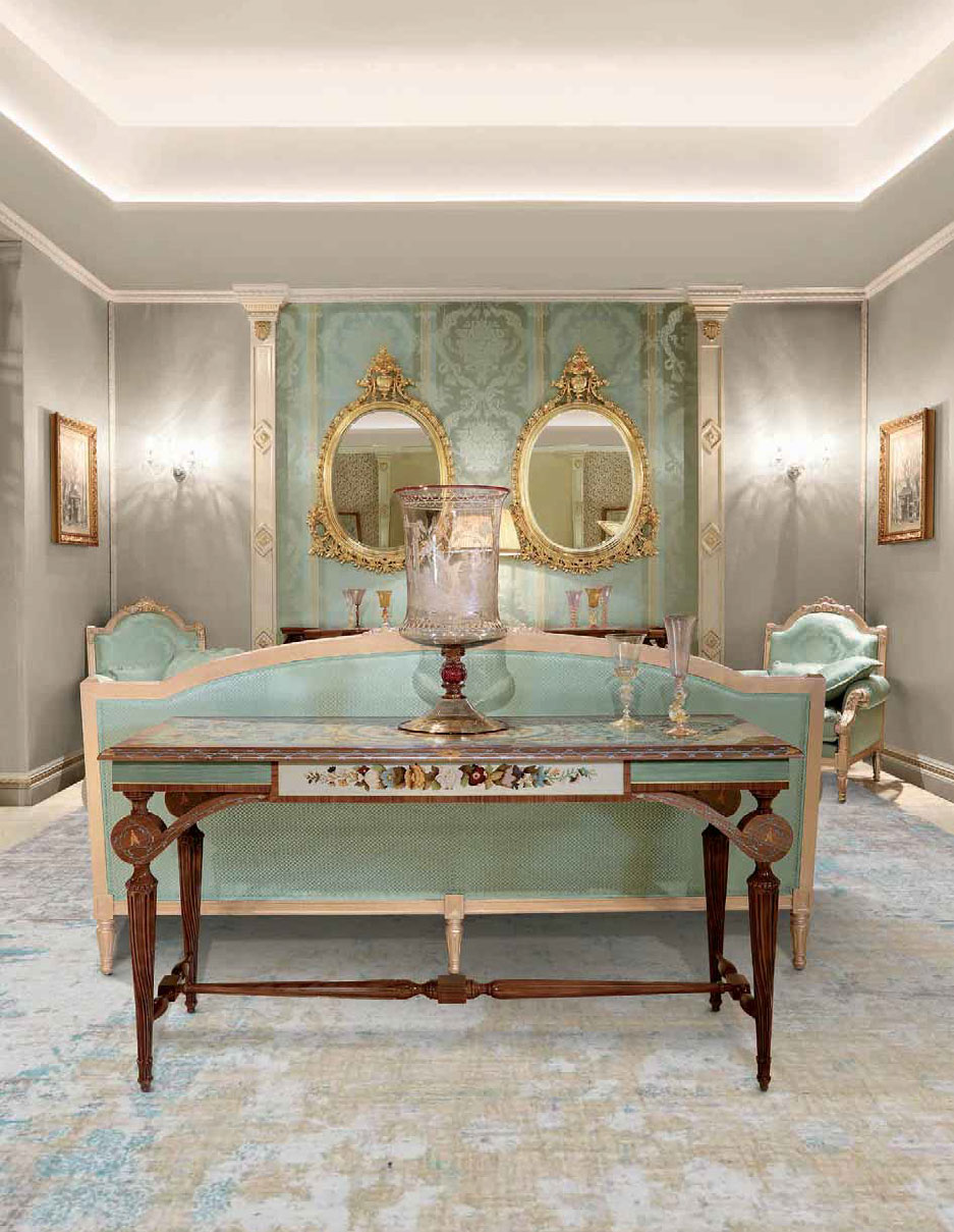 An exquisite expression of Italian artistry, this console table features a spectacular inlaid tabletop showcasing vibrant natural-colored floral motifs arranged around an elegant central medallion. Each element of the composition is realized through the centuries-old Intarsia technique, where master artisans meticulously assemble hand-cut veneers to create a richly layered pictorial surface. The shimmering aluminum background enhances the depth and luminosity of the floral marquetry, transforming the tabletop into a true decorative panel. The frame is sculpted in solid Noce Canaletto, prized for its refined grain and enduring stability. Hand-carved accents, tapered legs, and an architectural stretcher underscore the tables classical inspiration, while the natural finish celebrates the noble warmth of the walnut. Delicate floral inlays also embellish the surrounding apron, creating a harmonious dialogue between structure and ornamentation. Elegant, graceful, and unmistakably Italian, this console is ideal for grand entryways, refined salons, or behind a statement sofa where its artistic surface can be admired as both fine furniture and functional artwork. A masterpiece destined for the most distinguished interiors.