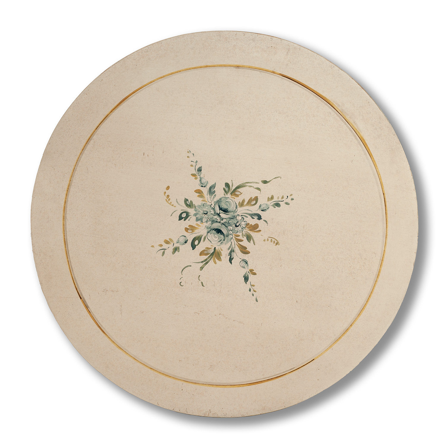 This charming Italian round lamp table blends refined hand craftsmanship with the soft romance of traditional European painting. Handcrafted in Italy, the piece features a gracefully turned pedestal base resting on four delicately scalloped legs, each finished in a warm antique patina that evokes the character of a well-loved heirloom. The round top is beautifully accented with a hand-painted floral medallion in muted sage and soft gold tones, framed by a subtle double border that enhances its classical symmetry. Every brushstroke is applied by skilled Italian artisans, giving the table an unmistakable individuality and warmth. A lightly distressed finish adds depth and authenticity, allowing this piece to integrate effortlessly into French Country, Tuscan, or Transitional interiors. Perfect beside a sofa, reading chair, or bed, this versatile table offers both decorative charm and everyday utility. Its timeless silhouette and artisan-painted details make it an elegant accent that elevates any space.