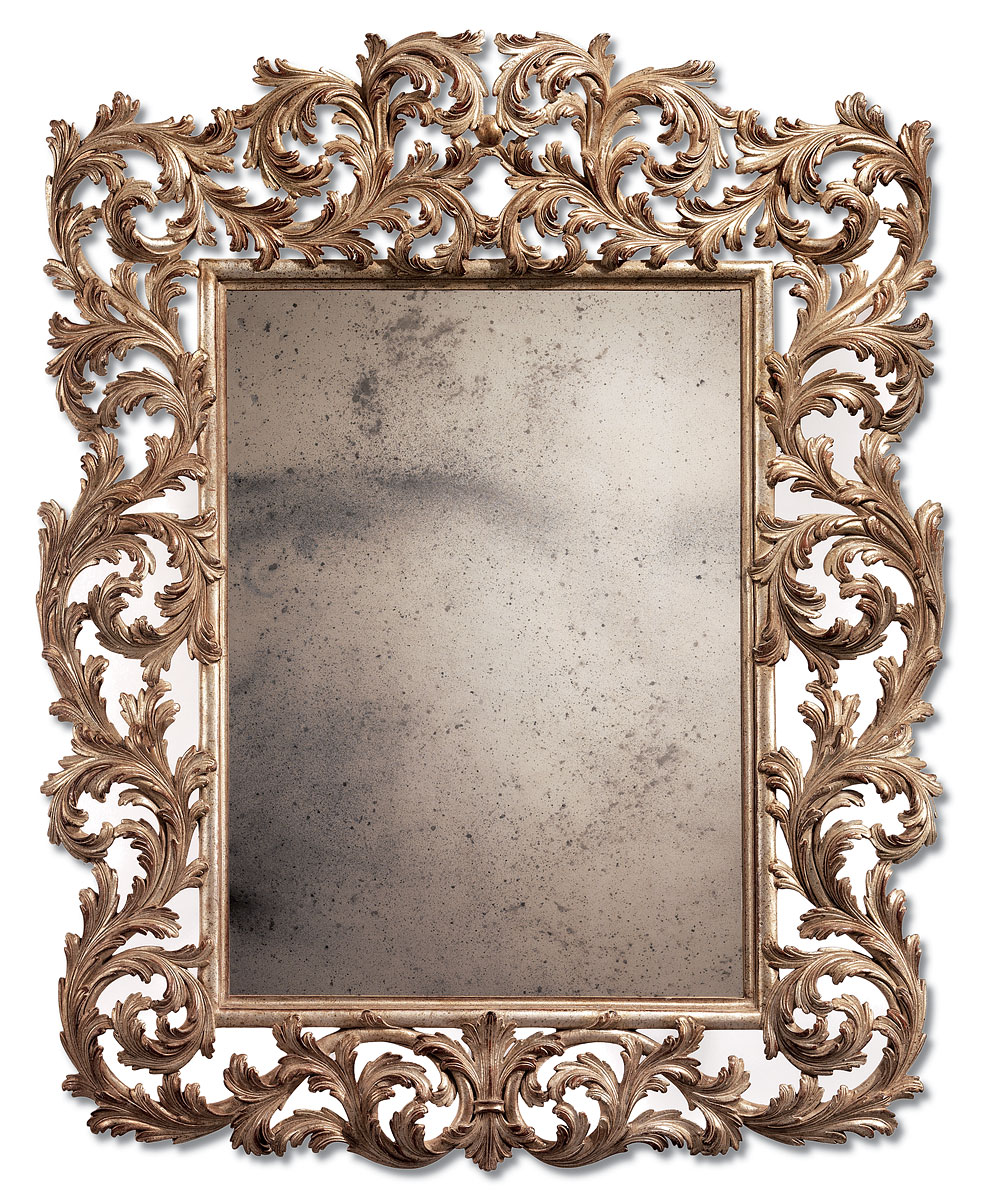 Handcrafted in Italy, this dramatic Florentine Baroque mirror is framed by a lavishly hand-carved surround of swirling acanthus leaves and ornate scrollwork. The intricate frame is finished in a warm antique patina that complements the aged character of the antiqued mirror glass. A stunning example of Italian craftsmanship, this mirror captures the theatrical grandeur of the Baroque period – perfect for formal interiors, grand foyers, or above a richly adorned console.