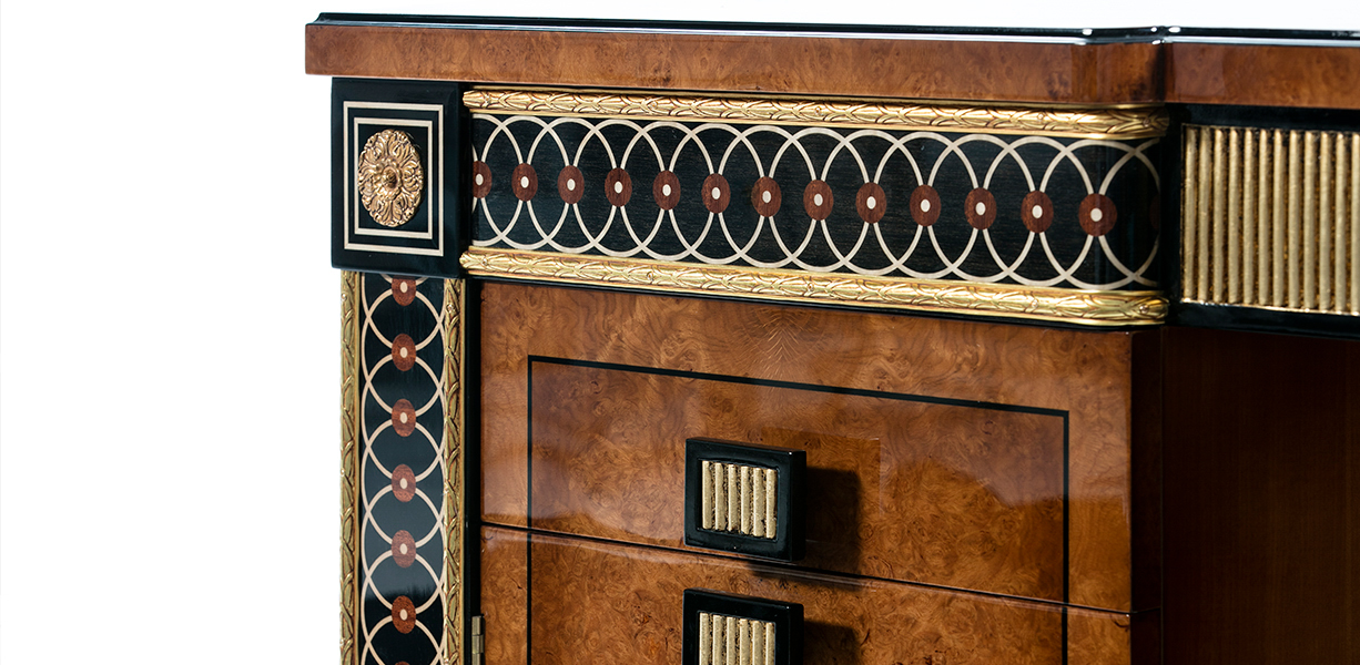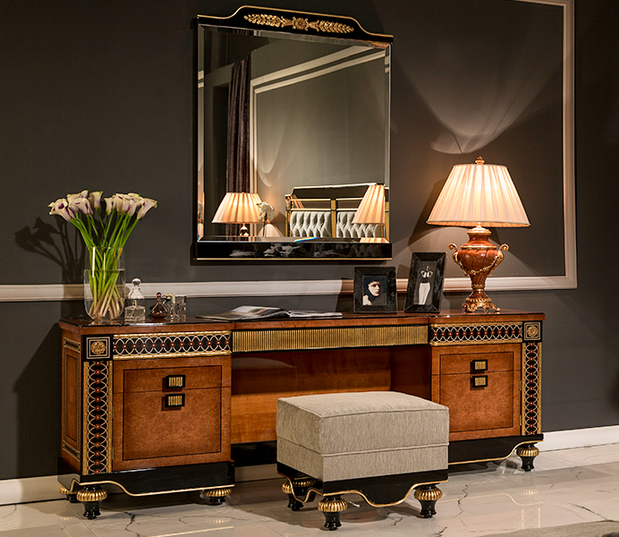 A luxurious expression of neoclassical artistry, this dressing table is handcrafted in Spain with an emphasis on symmetry, refinement, and timeless detail. The case is veneered in radiant oak burl, its warm grain beautifully framed by sycamore inlays that enrich the design with contrast and definition. A lustrous high-gloss finish enhances the natural depth of the wood, underscoring its elegance. The faade is adorned with finely cast bronze latticework, detailed with ebony and highlighted with gilded medallions. A central fluted bronze panel creates balance, while sculpted gilt ornaments crown the turned feet, reinforcing the tables classical presence. Functional drawers on each side provide ample storage, seamlessly blending practicality with decorative grandeur. Designed to harmonize with a complete bedroom suite, this dressing table serves as both a functional workspace and an ornamental showpiece. Its bold proportions, fine materials, and intricate detailing embody the artistry and enduring legacy of European craftsmanship.