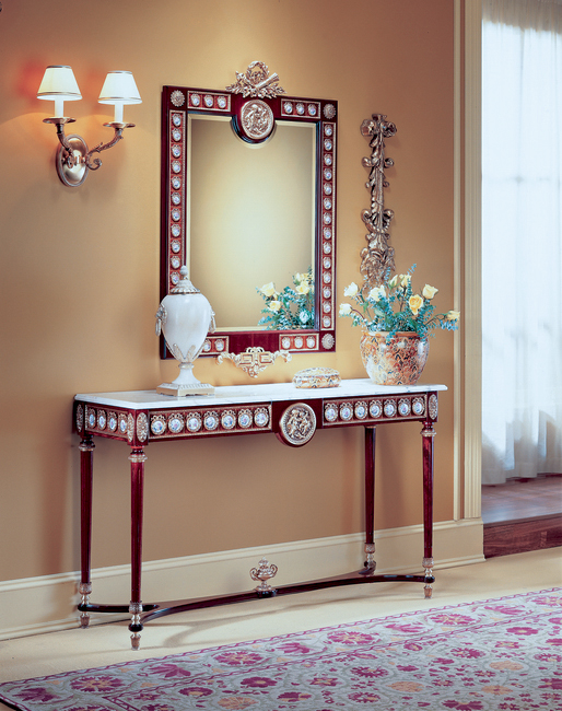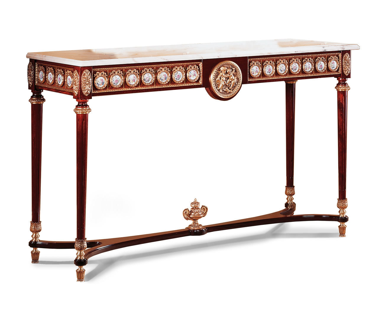 A masterpiece of European refinement and neoclassical grandeur, this Louis XVI-style console table is a striking statement of luxury and craftsmanship. The rosewood veneer exudes warmth and depth, elegantly complemented by a sumptuous marble top, offering a timeless elegance fit for the most distinguished interiors. The apron is adorned with hand-painted porcelain medallions, each delicately framed in 24-karat gold-plated solid brass ormolus, enhancing its regal aesthetic. A central gilded medallion serves as the focal point, adding a touch of sculptural artistry. Fluted tapered legs, embellished with finely cast gilded accents, are elegantly connected by a sinuous stretcher, adorned with a neoclassical urn finial an homage to traditional European design. A perfect balance of artistry and function, this handcrafted console table is a true collectors piece. Handcrafted in Spain.