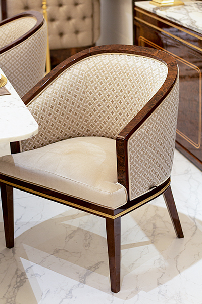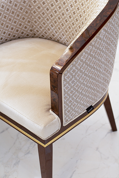 Transitional Occasional Tub Chair. Walnut with antique gold accents. Made in Spain. COM 3.5 yards
