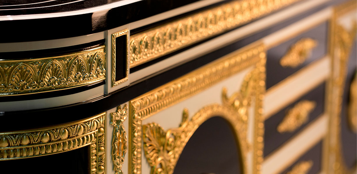 Sideboard. Hand crafted in Spain. Combination of Off White and Black Lacquer finish. Apron with 24 karat gold plated band. Two doors and four drawers. 24 karat gold plated castings. High gloss polyurethane finish.