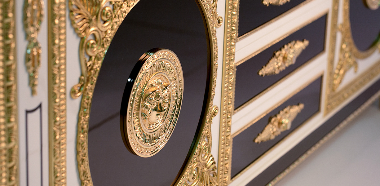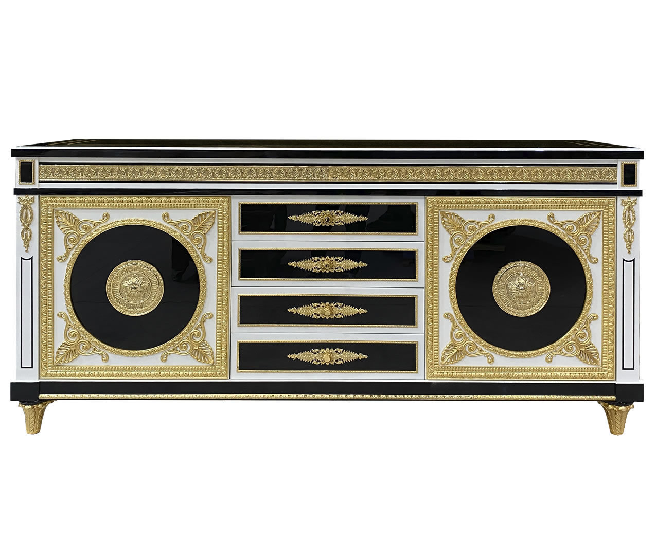 Handcrafted in Spain. Shown in off-white and black high-gloss lacquer finish. Features elaborately cast brass ormolus plated in 24-karat gold, including oversized round medallions with classical profile reliefs. Apron adorned with an ornate gold-plated frieze band. Center section includes four drawers with gold-accented bronze pulls. High-gloss polyurethane finish.