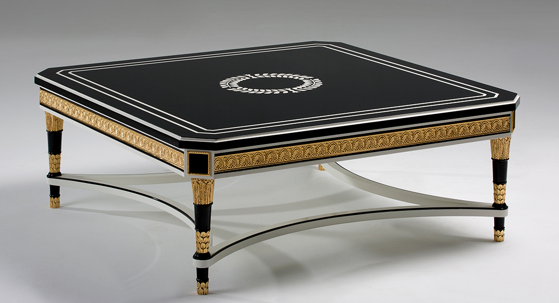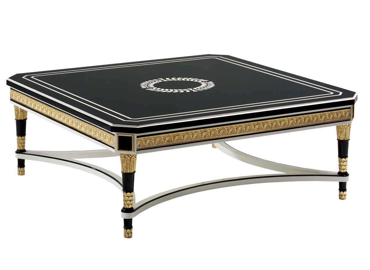 Square coffee Table. Hand crafted in Spain. Shown in a combination of Black and Off white lacquer finish. Apron with 24 karat gold plated band. 24 karat Gold plated ormolus. High gloss polyurethane finish.