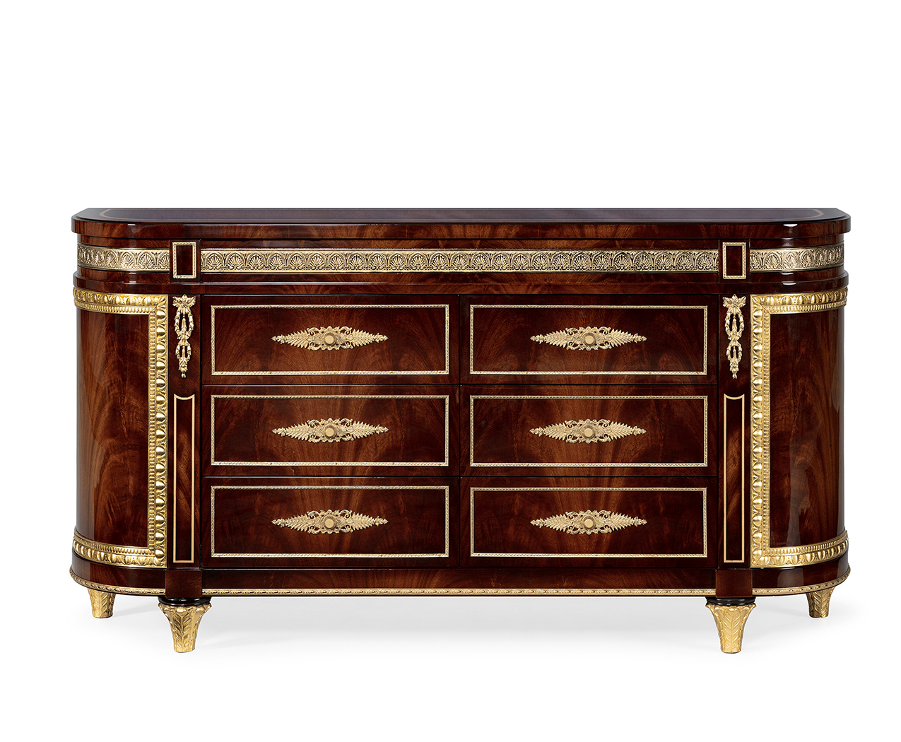 Hand crafted in Spain. This elegant neoclassical sideboard showcases rich Cerejeira wood enveloped in a high-gloss polyurethane finish that highlights its natural grain and warm tone. The curved corners and fluted details are embellished with cast bronze ornaments and appliques, all finished in antique gold leaf for a timeless, regal appeal. Featuring six drawers framed in fine gold accents and mounted on tapered legs with gilt sabots, this piece merges classical grandeur with functional storage.