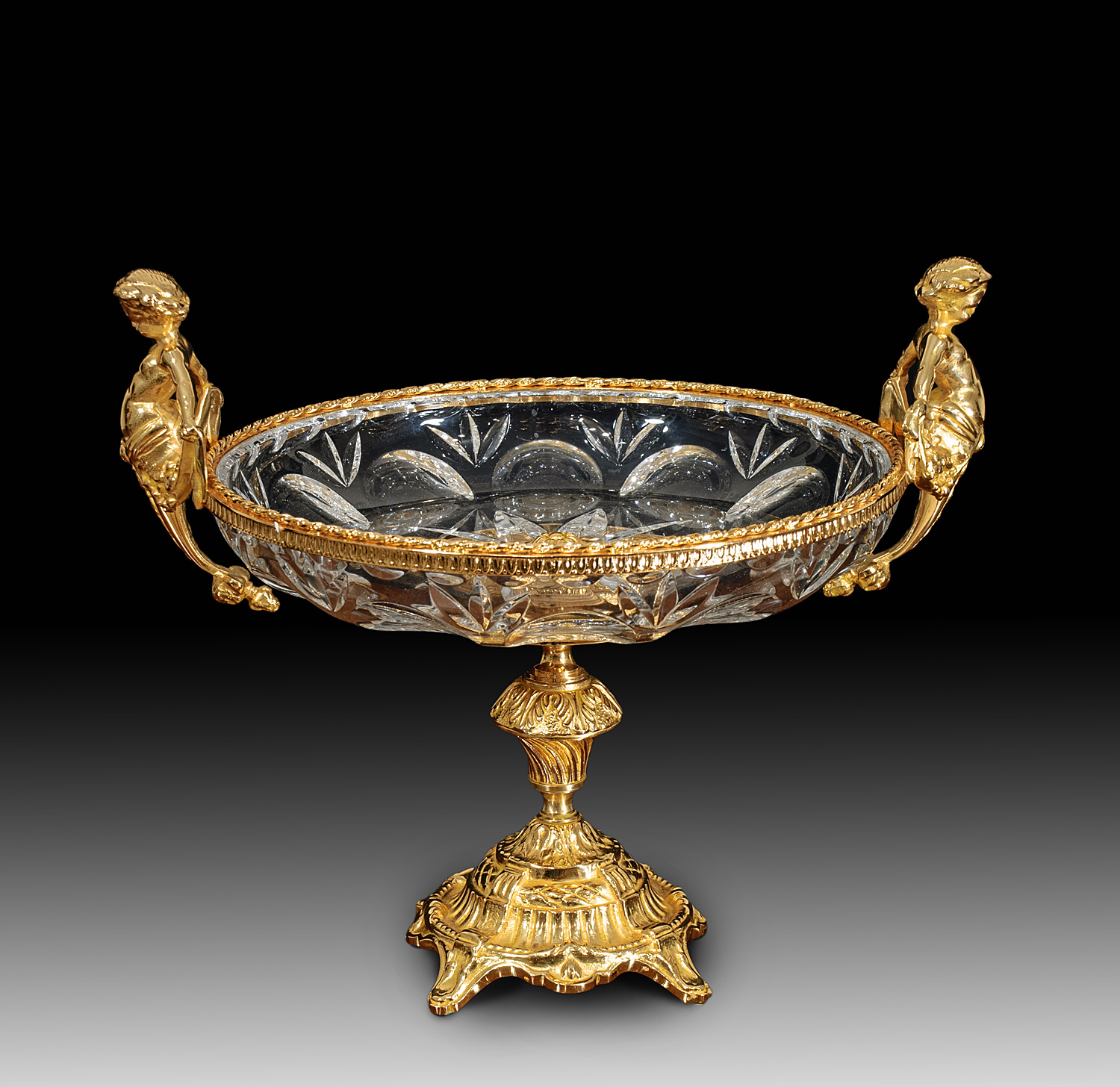 An exquisite fusion of craftsmanship and artistry, this hand-cut jardiniere is crafted from 24 percent lead German crystal and set in a richly detailed bronze base plated in 24-karat gold. The scalloped bowl features a refined leaf motif, while the twin female bust handles and ornate pedestal evoke classical French design. A luxurious centerpiece or decorative accent. Hand made in France.