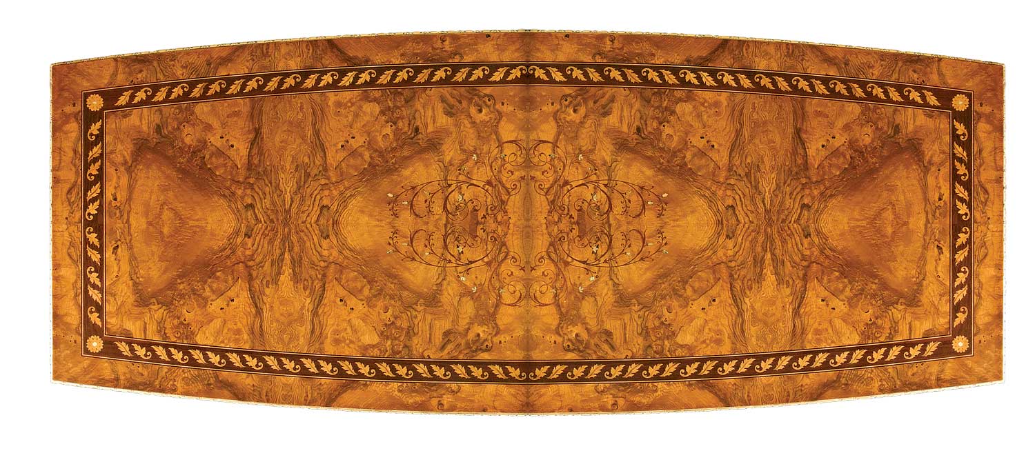 Handcrafted in Italy, this exquisite 157″ dining table features a stunning top in myrtle burl, enriched with inlays in rosewood and satinwood. The curved apron is adorned with detailed carvings, while the dual pedestals are meticulously hand carved and accented in 24-karat gold leaf. Finished in a classic medium sheen lacquer, this piece is a masterful blend of fine craftsmanship and timeless elegance.