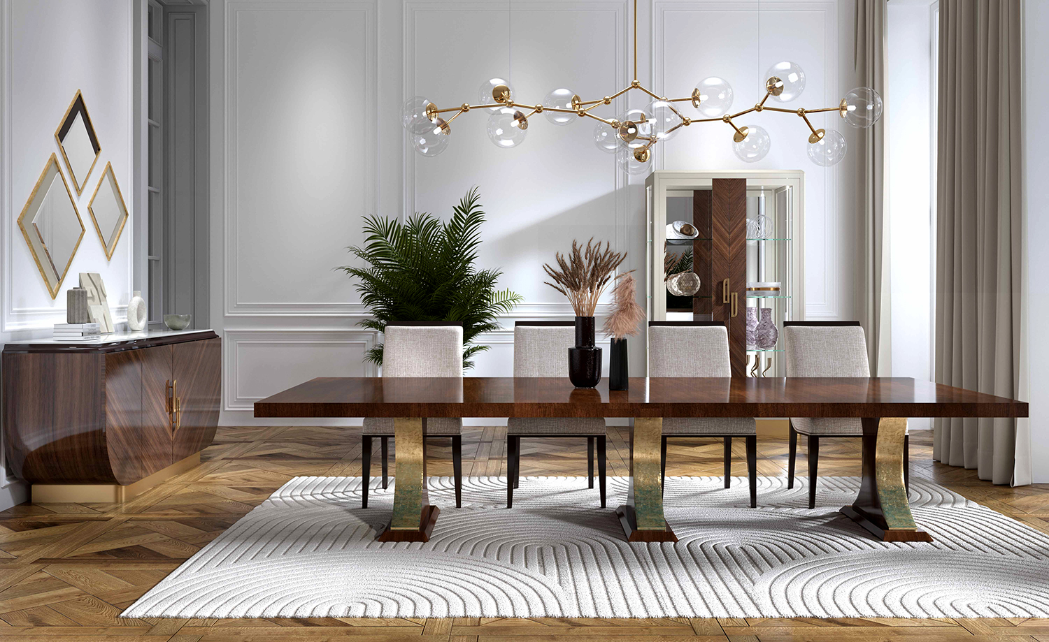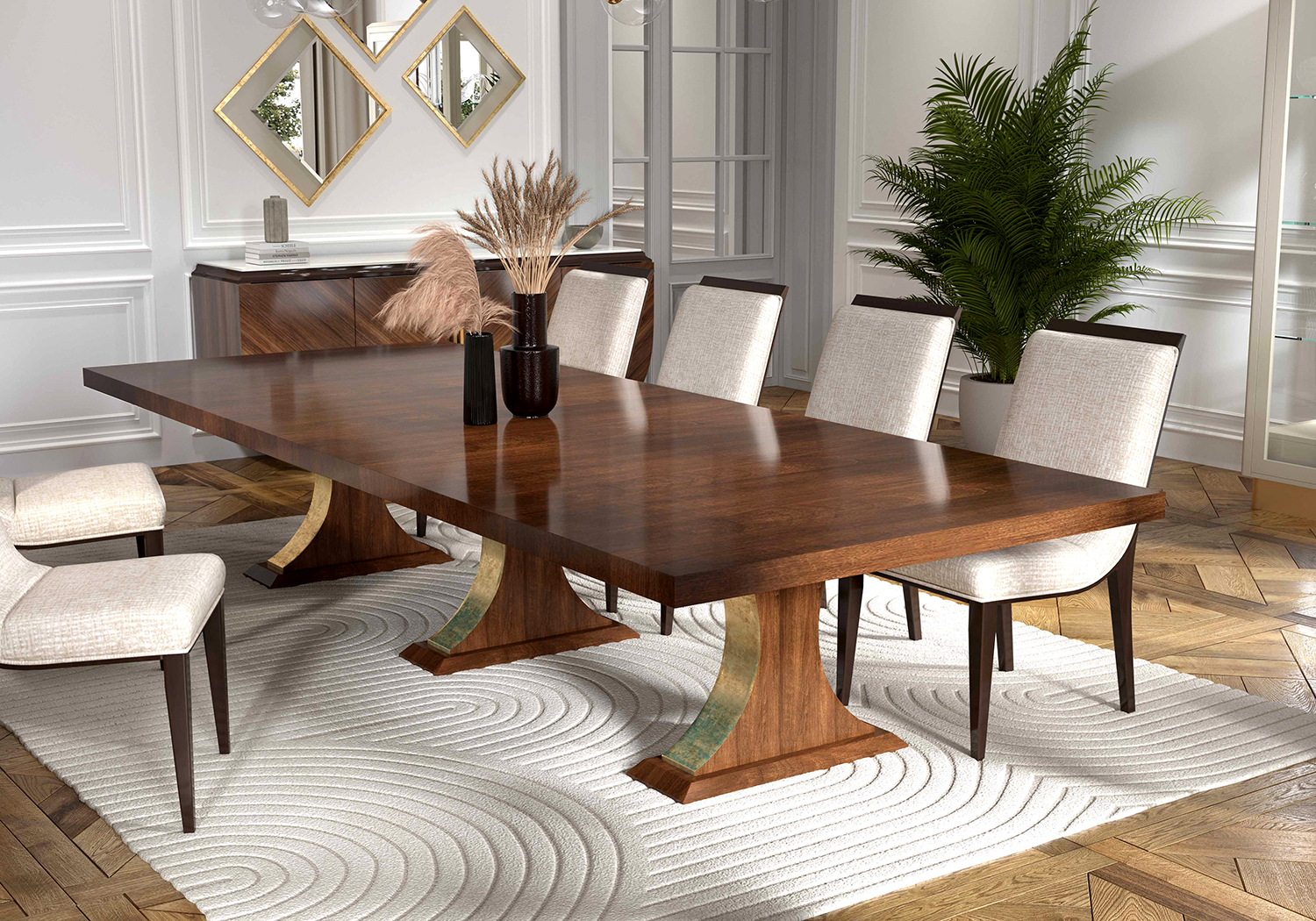 Transitional dining table. Hand crafted in Italy. Solid wood with Tulip wood veneer top. Three pedestals in 24 karat gold leaf. Two 20″ leaves stored in end drawers.