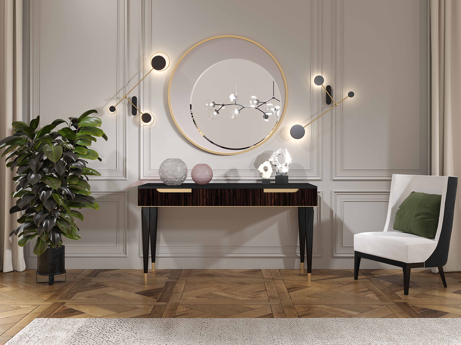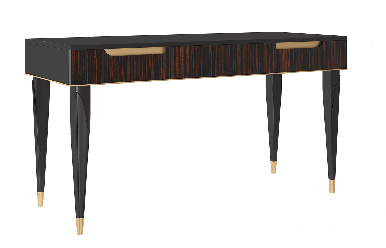 Transitional console table. Hand crafted in Italy. Black Brown lacquer finish. Three drawers with Makassar ebony veneer front panels. 24 karat gold leaf accents. Brass hardware.