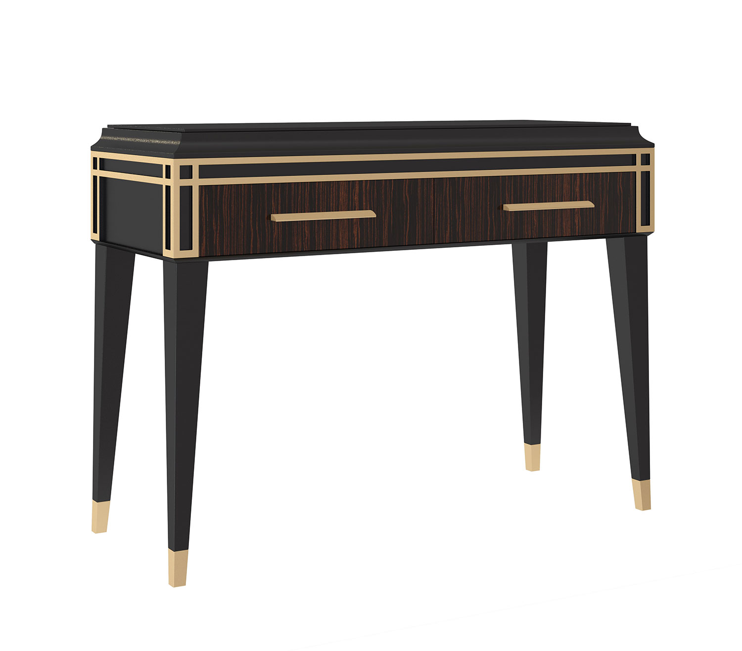 Transitional console table. Hand crafted in Italy. Black Brown lacquer finish. Two drawers with Makassar ebony veneer front panels. 24 karat gold leaf accents. Brass hardware.