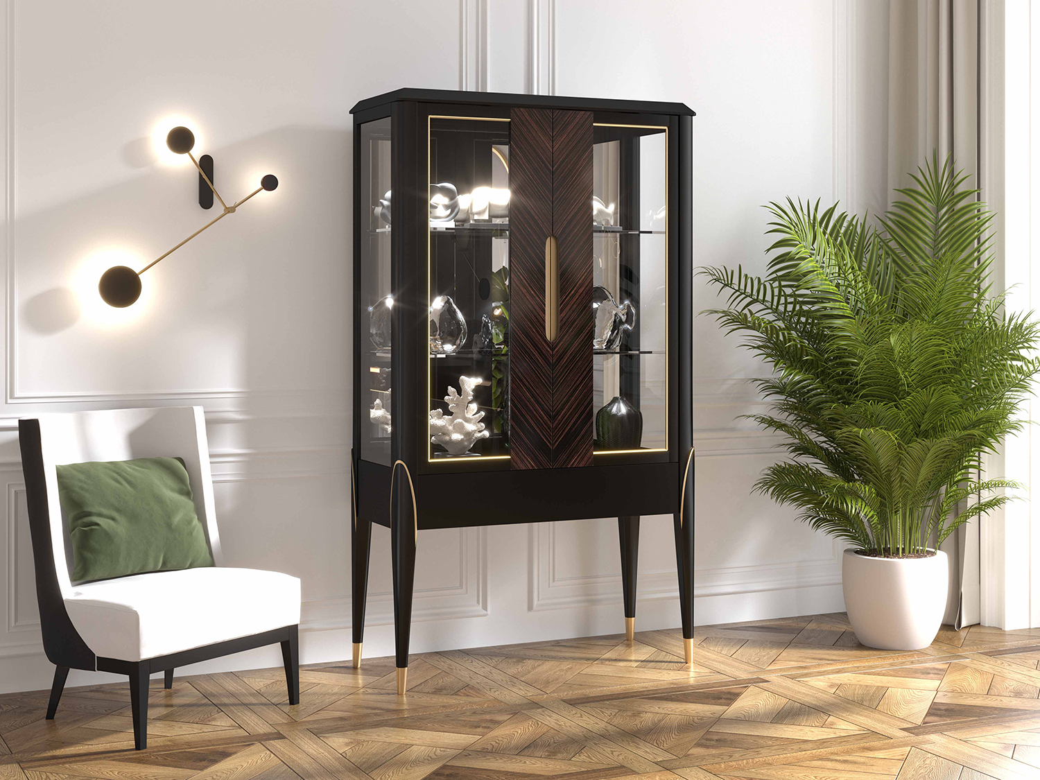 Transitional Vitrine. Hand crafted in Italy. Black Brown lacquer finish. One drawer. Makassar ebony veneer. 24 karat gold leaf accents. Brass hardware. LED lighted interior